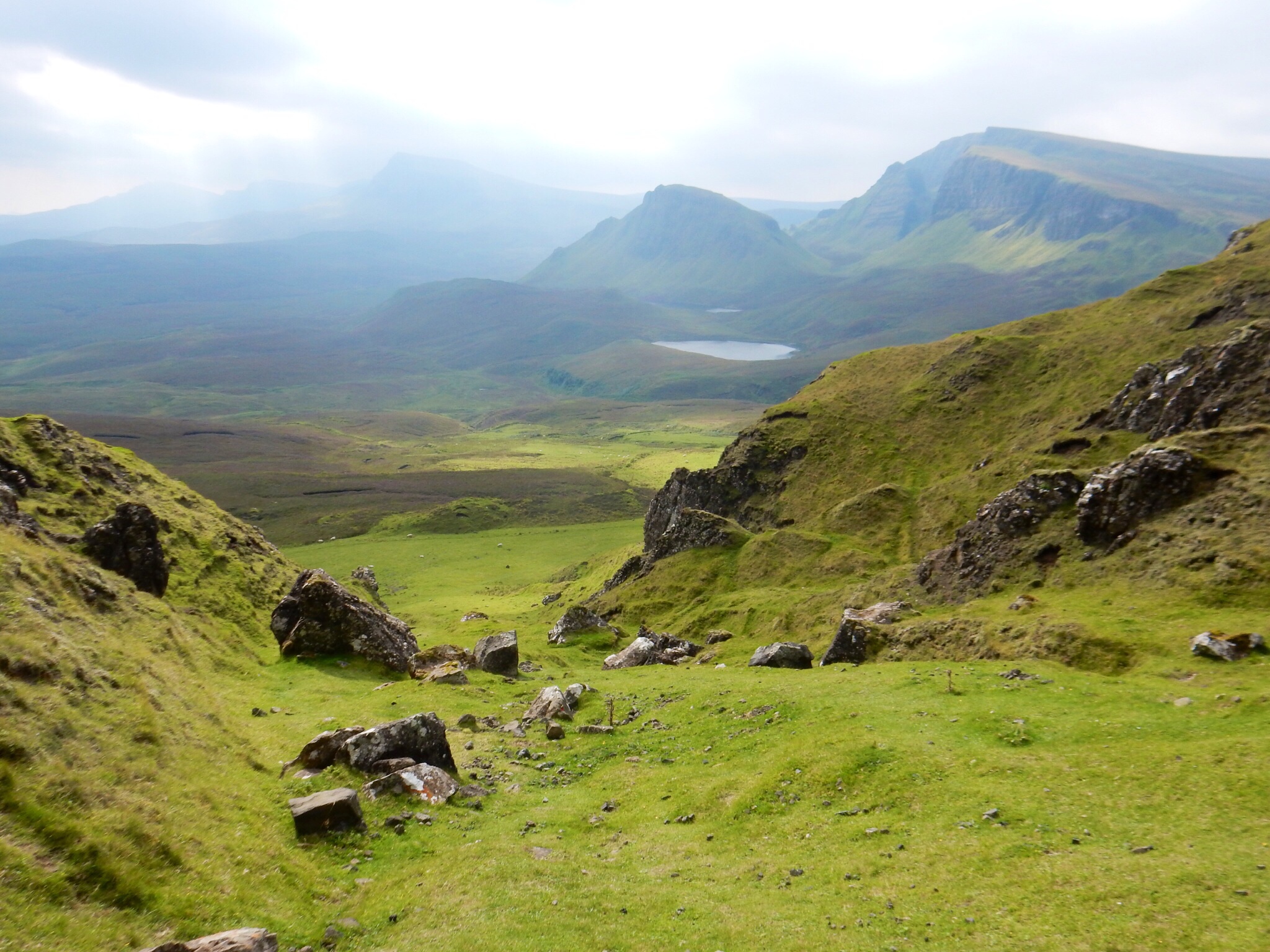 I continued onto a side road to Quiraing, an area of unusual rocky formations in the Trotternish ridge. Parked and hiked for a couple of hours up a steep trail through sheep meadows and then loose rocks to get near the base of the Needle and Prison formations. The views were stunning in every direction.