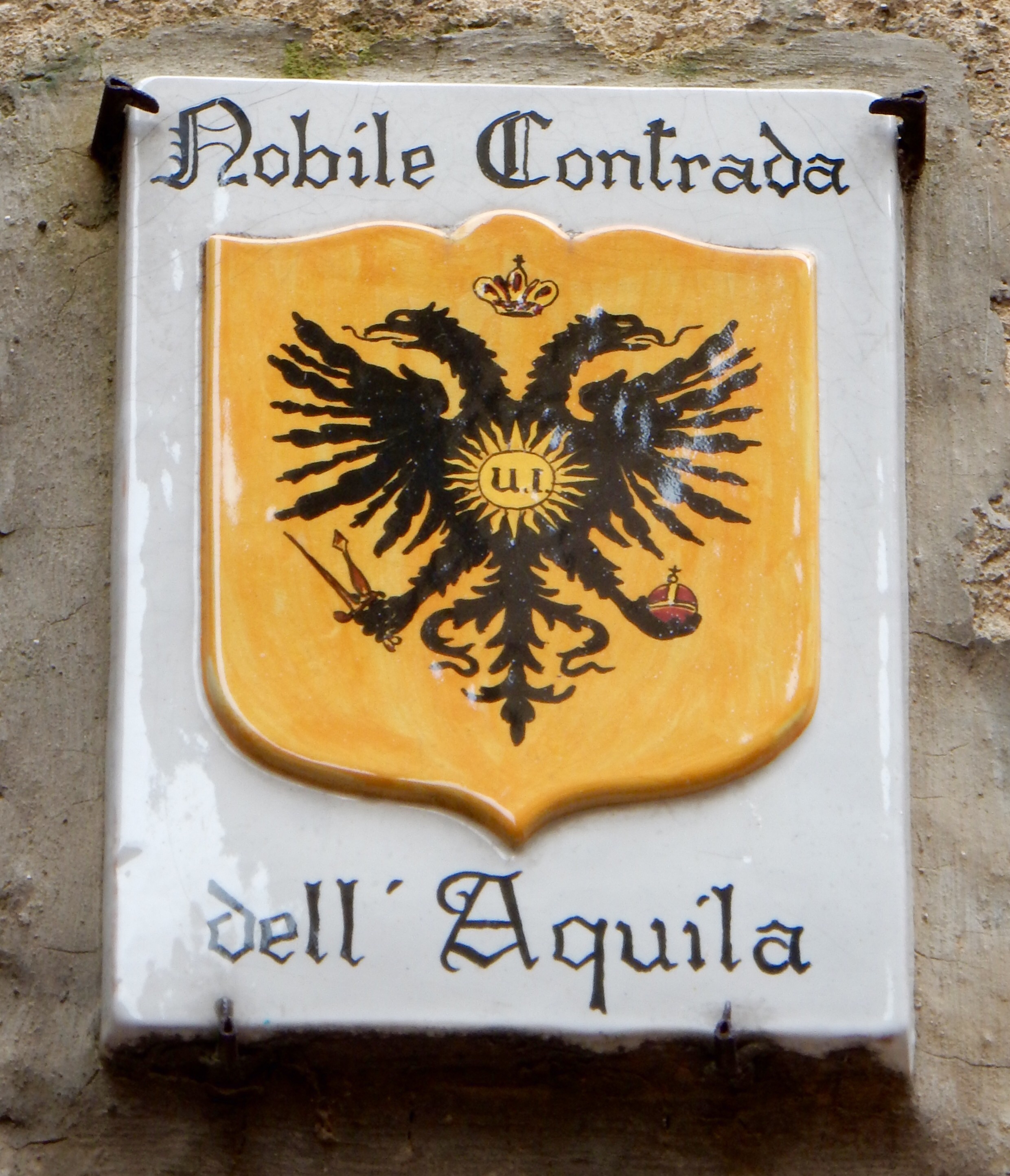 Twice a year, during the Palio, the town’s neighborhoods race horses around the sharp edges of the square. Each of the seventeen contrade (neighborhoods) wears its colors and rallies around a mascot. Ten contrade are selected by lottery to compete in the race.