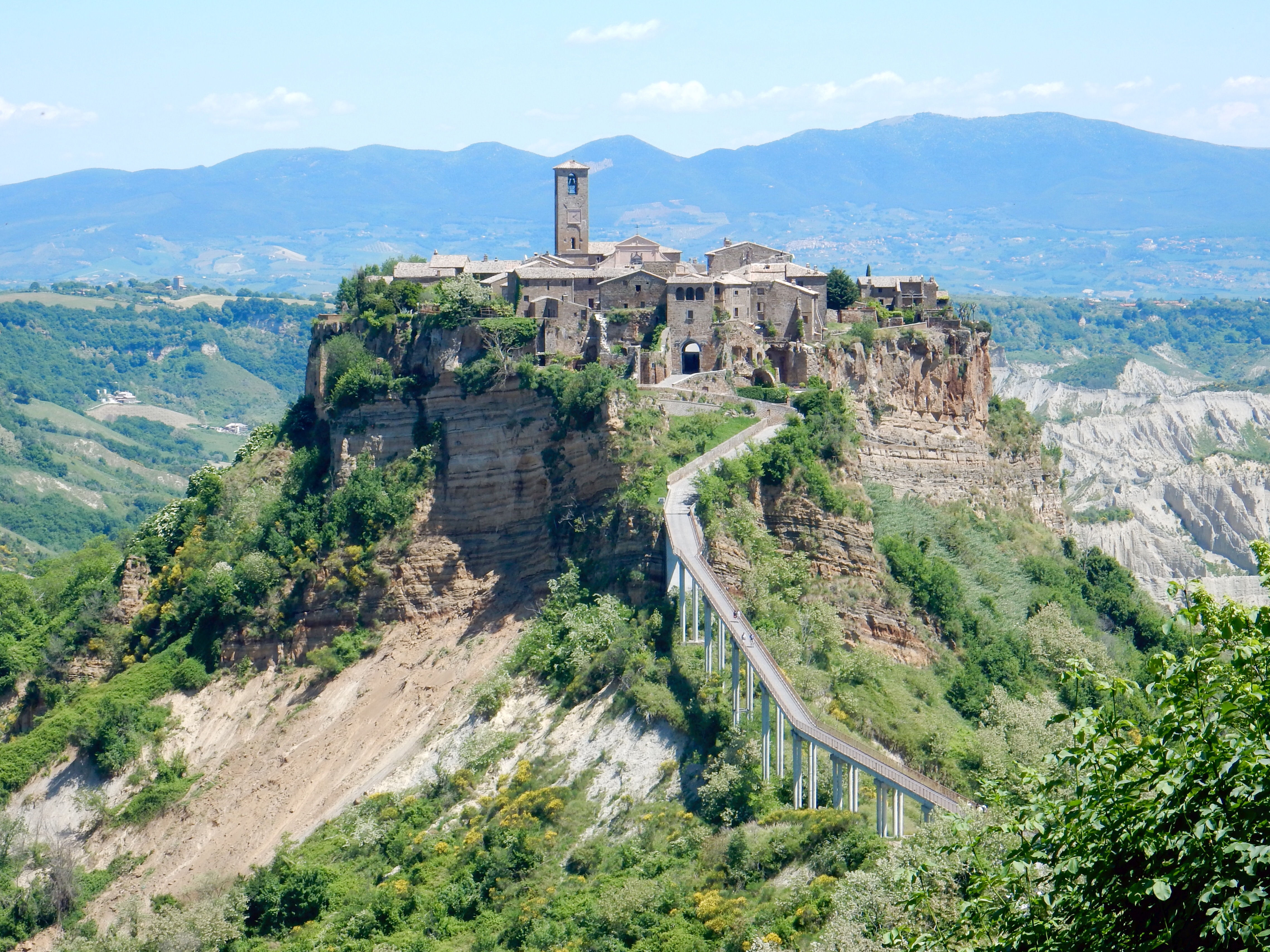 Civita’s dozen or so residents are connected to the outside world only by a footbridge. (No cars, but it is Vespa-accessible.) The new bridge, erected in 1966, replaced a donkey path on a ridge that collapsed during an earthquake.