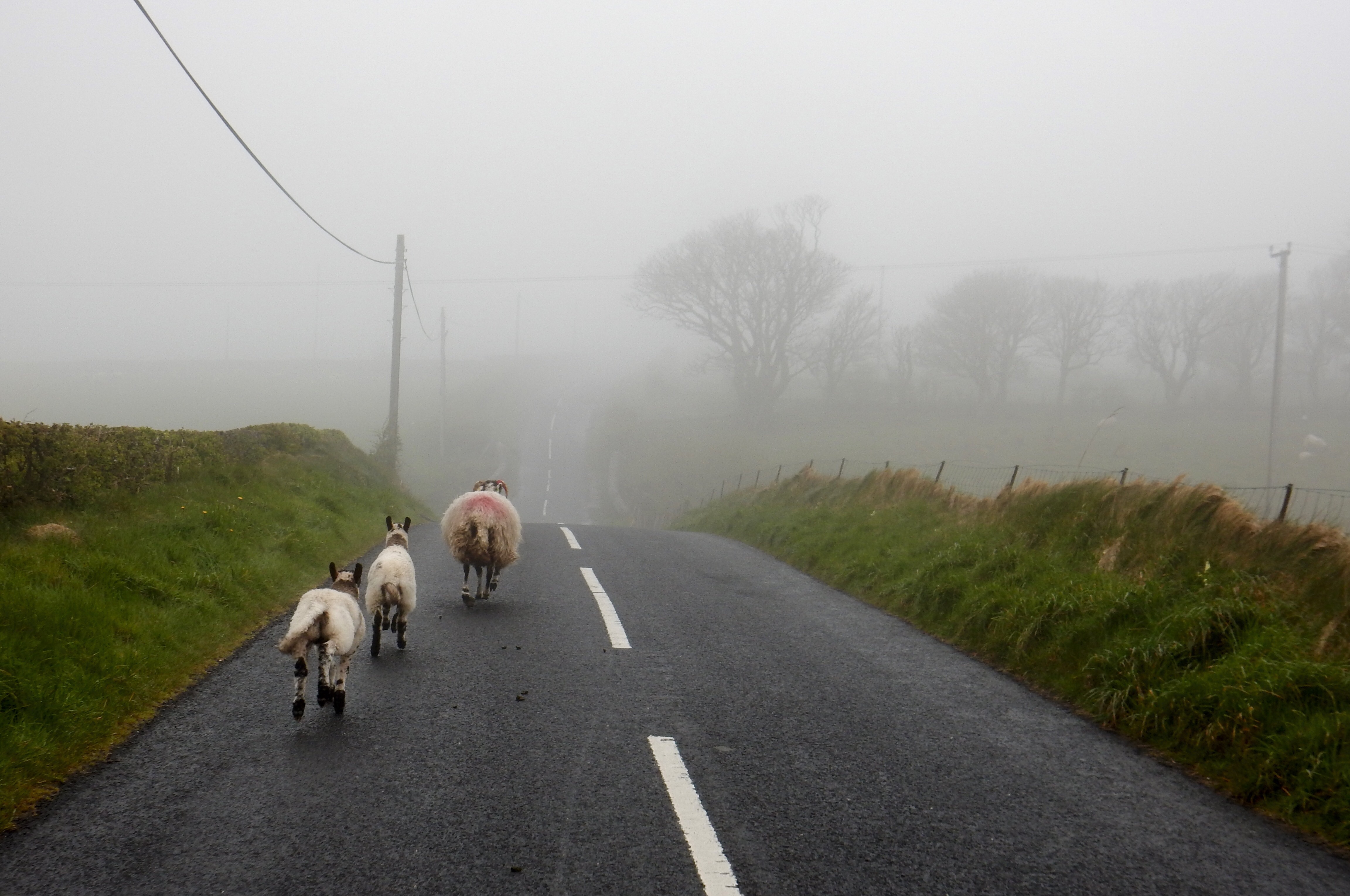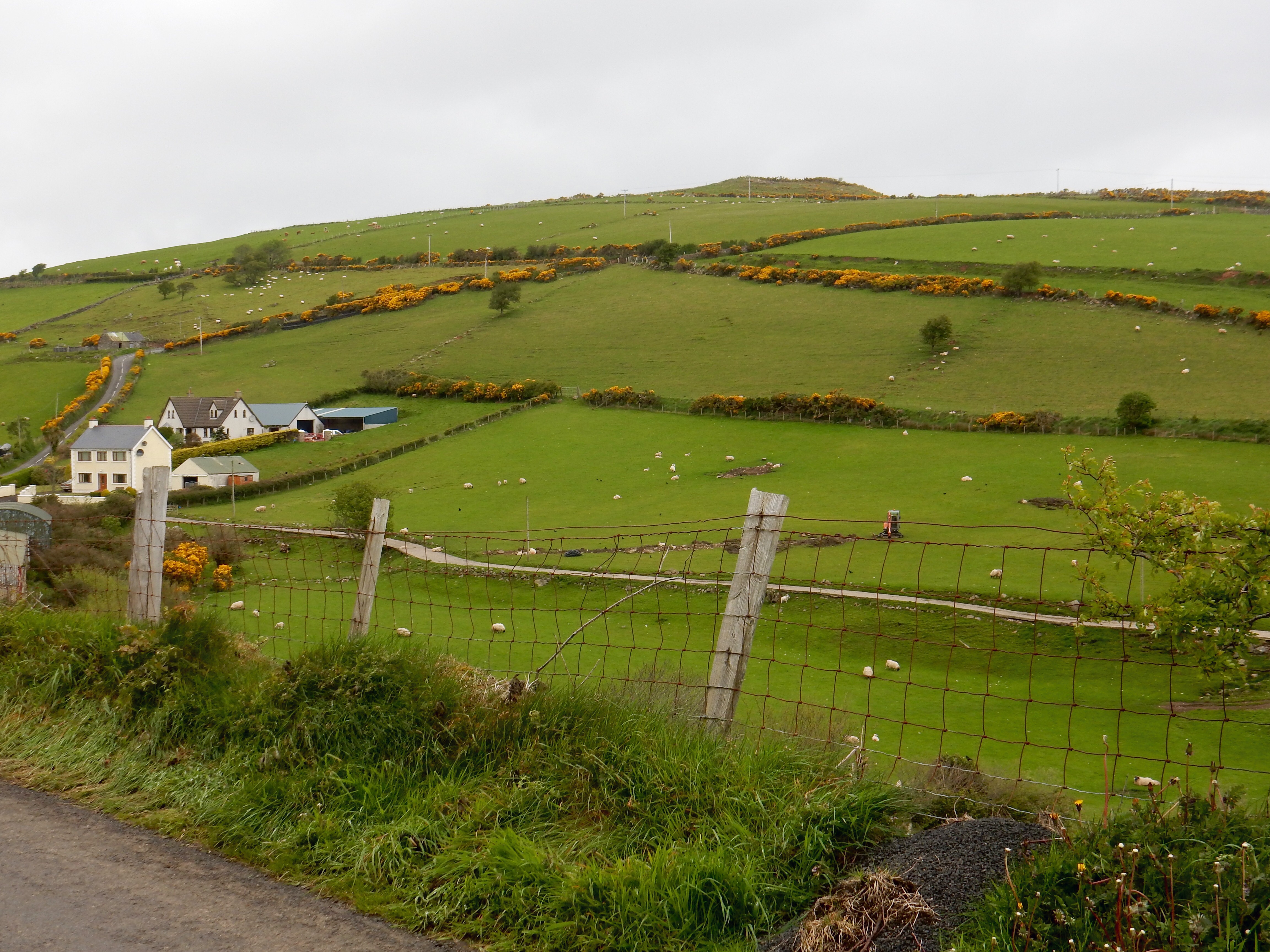 Next day I followed the rocky route along the Antrim Coast, mountains sloping steeply to the sea, rolling meadows dotted with sheep and divided by bright-yellow gorse hedges, stone walls, white houses trimmed in black, crumbling castles, lambs and calves in the greenest-green fields. Farmers stood nonchalantly in the drizzling rain, talking and smoking. Border collies hunkered when I passed. The road was a joy to drive and I often had it to myself. Circled the beautiful and majestic Glenariff. Took the high back road along the water to Torr Head. The fog disguised the steepness.