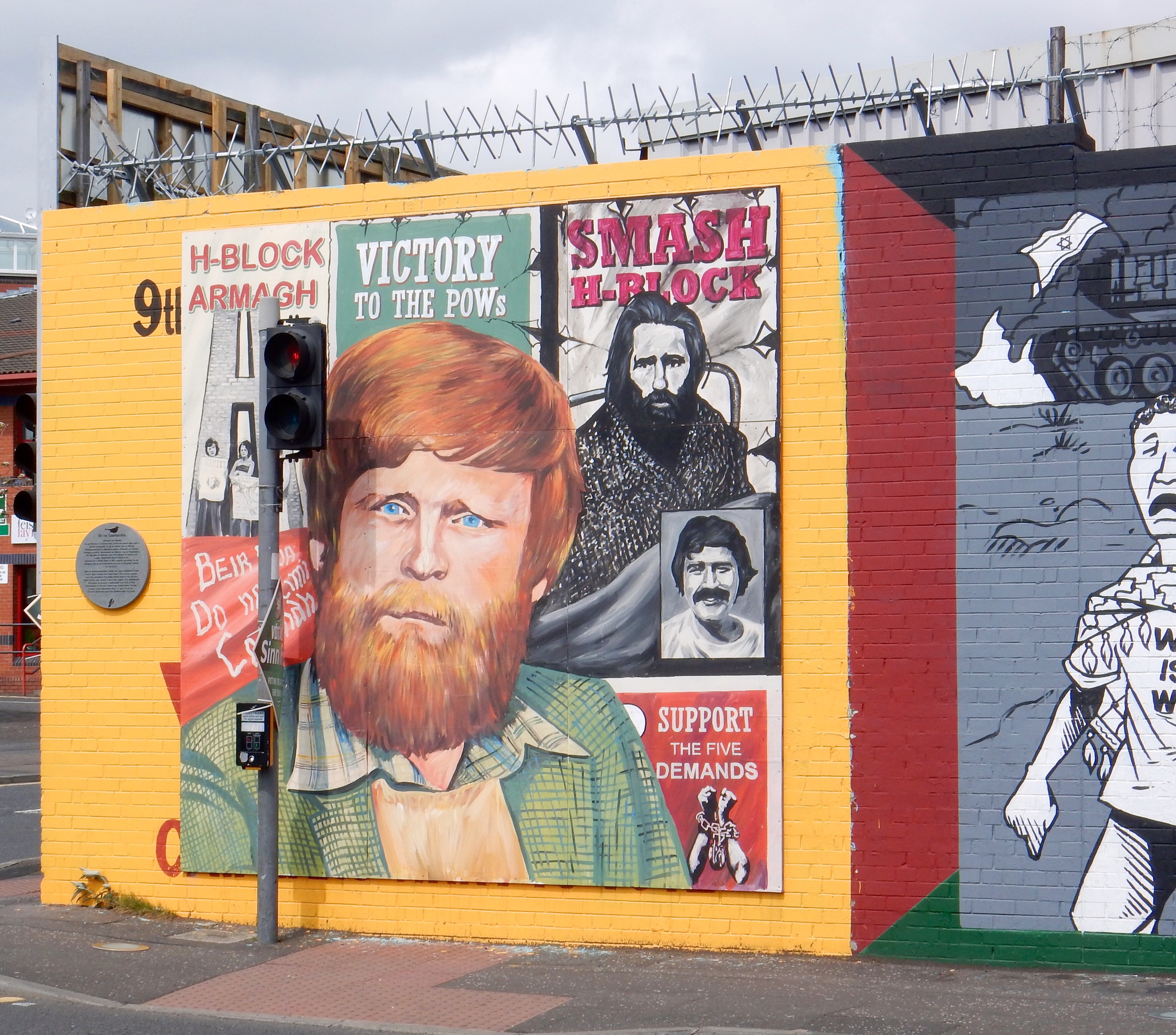 Ken started the tour in the republican neighborhood of Falls Road. He stopped the car several times so I could visit memorials, including Bobby Sands’s mural on the side of Sinn Féin’s offices. Sands was a member of the Provisional IRA who died in 1981 during a hunger strike while in prison. The strikers were fighting to be recognized as prisoners of war instead of criminals. The strike generated international awareness and made Sands a martyr. One hundred thousand people attended his funeral.