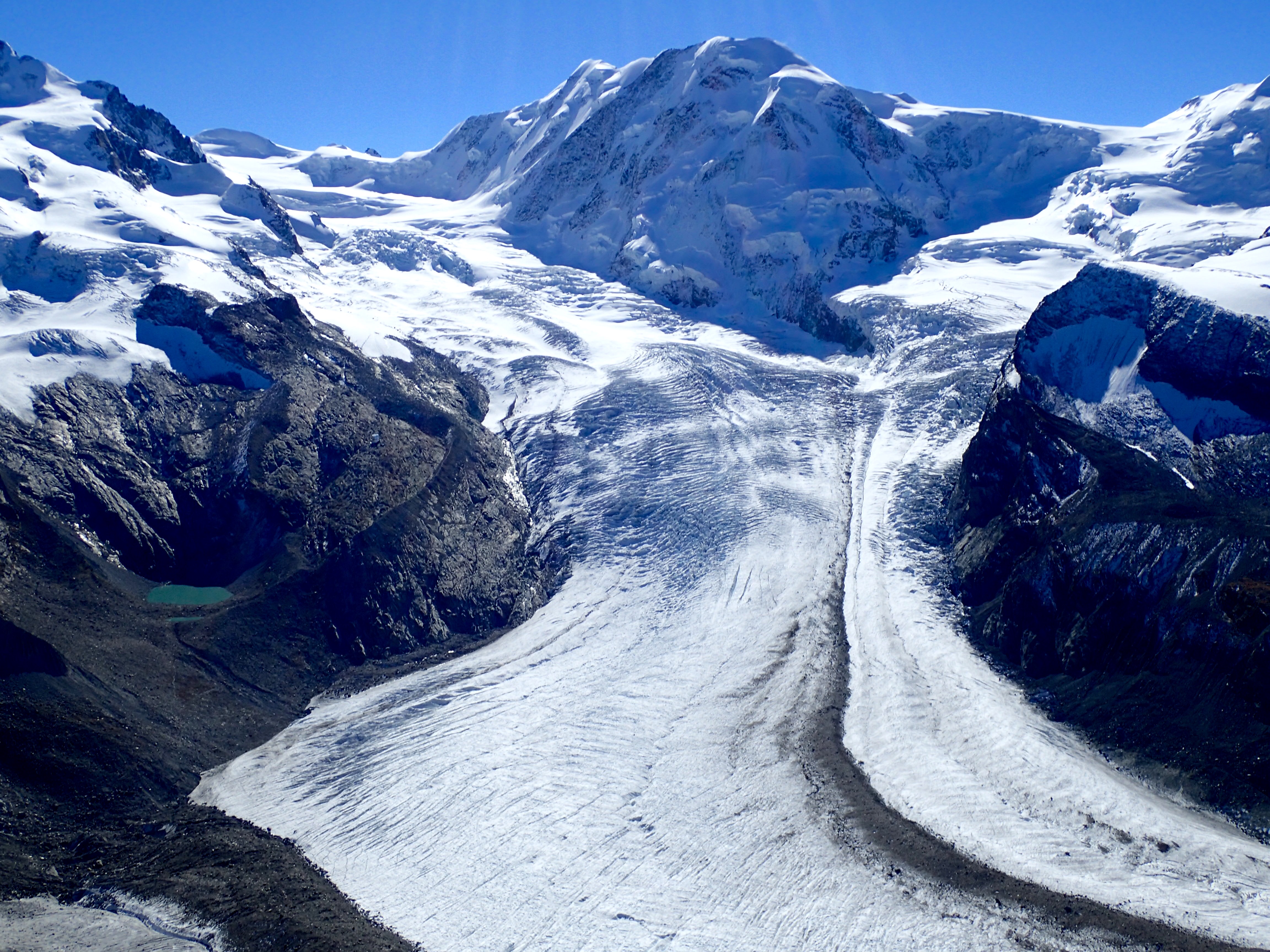 The air was clear and the sun bright. I didn’t need the extra gear I packed, the hat, gloves, or gaiters. In fact, I grew warm and stowed a layer. I could easily pick out Saint Moritz and its neighbors down in the valley. The series of lakes sparkled like jewels on a necklace. Tiny cars and trains threaded the green valley.