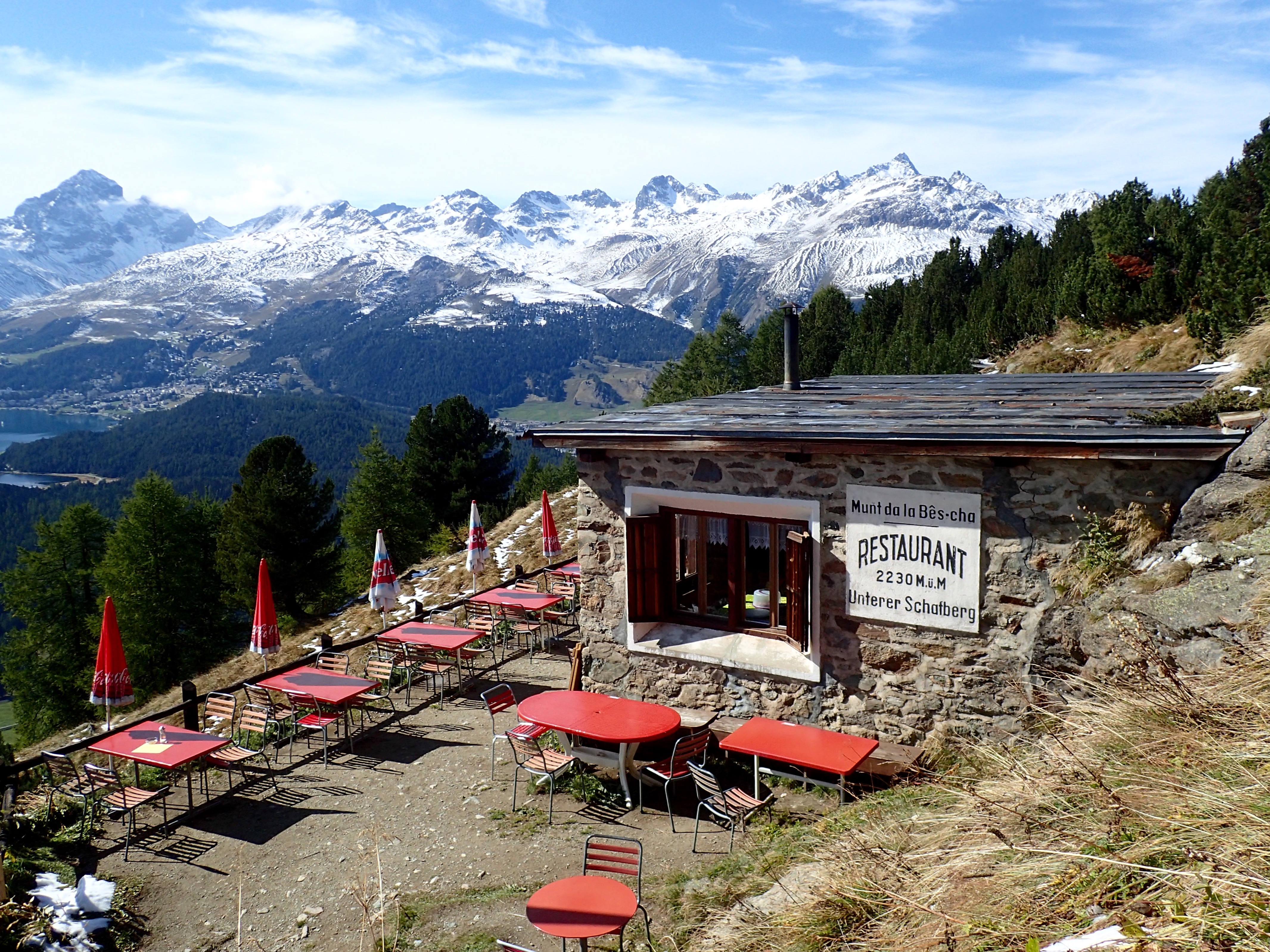 On top is a lodge and restaurant. Workers were shoveling yesterday’s snow from the deck with the help of occasional sunshine. Much colder and windier, but the view of the Bernina Alps across the Engadine Valley was spectacular.