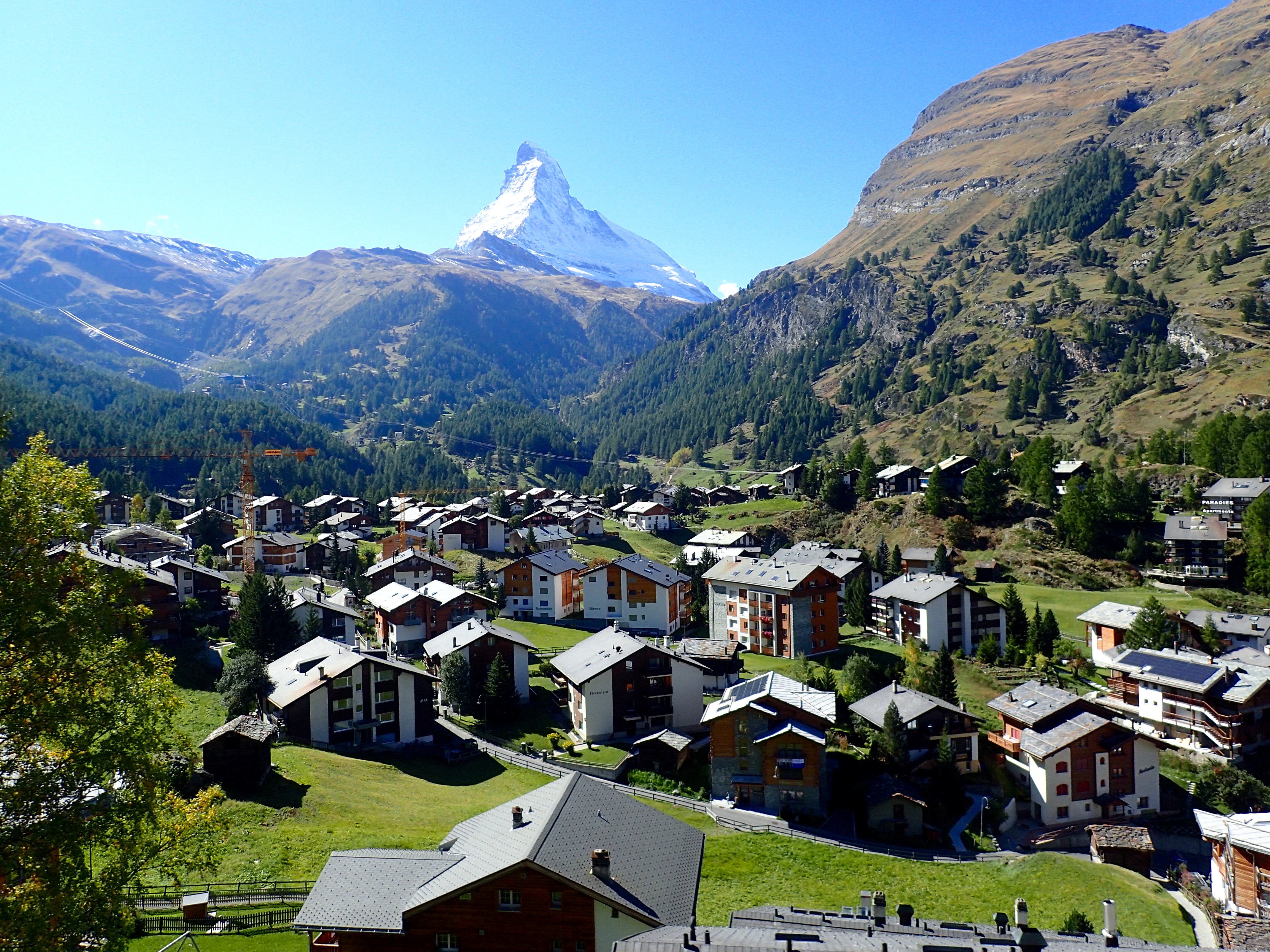 No cars are allowed in town except for taxis and commercial vehicles, which are electric and only slightly larger than golf carts. Checked into my hotel with the Matterhorn looming above. The amenities are basic. A rack for hiking boots near the front door. Comforter and down pillow only. No TV.