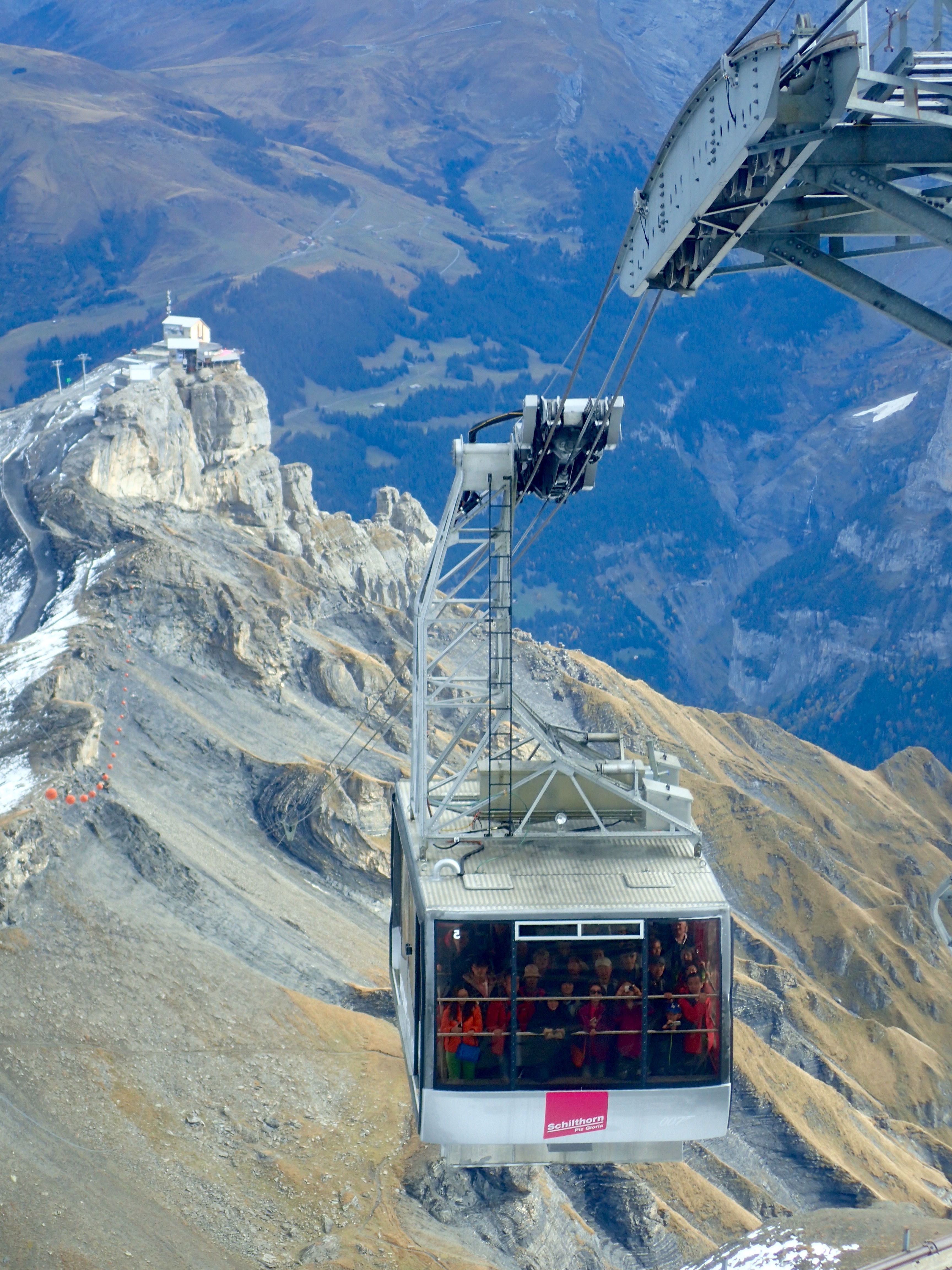 The cable car from Schilthornbahn was packed, maybe sixty people, all standing. Several were paragliders, returning to the top for another jump. As we climbed, the cliff face seemed only inches away.