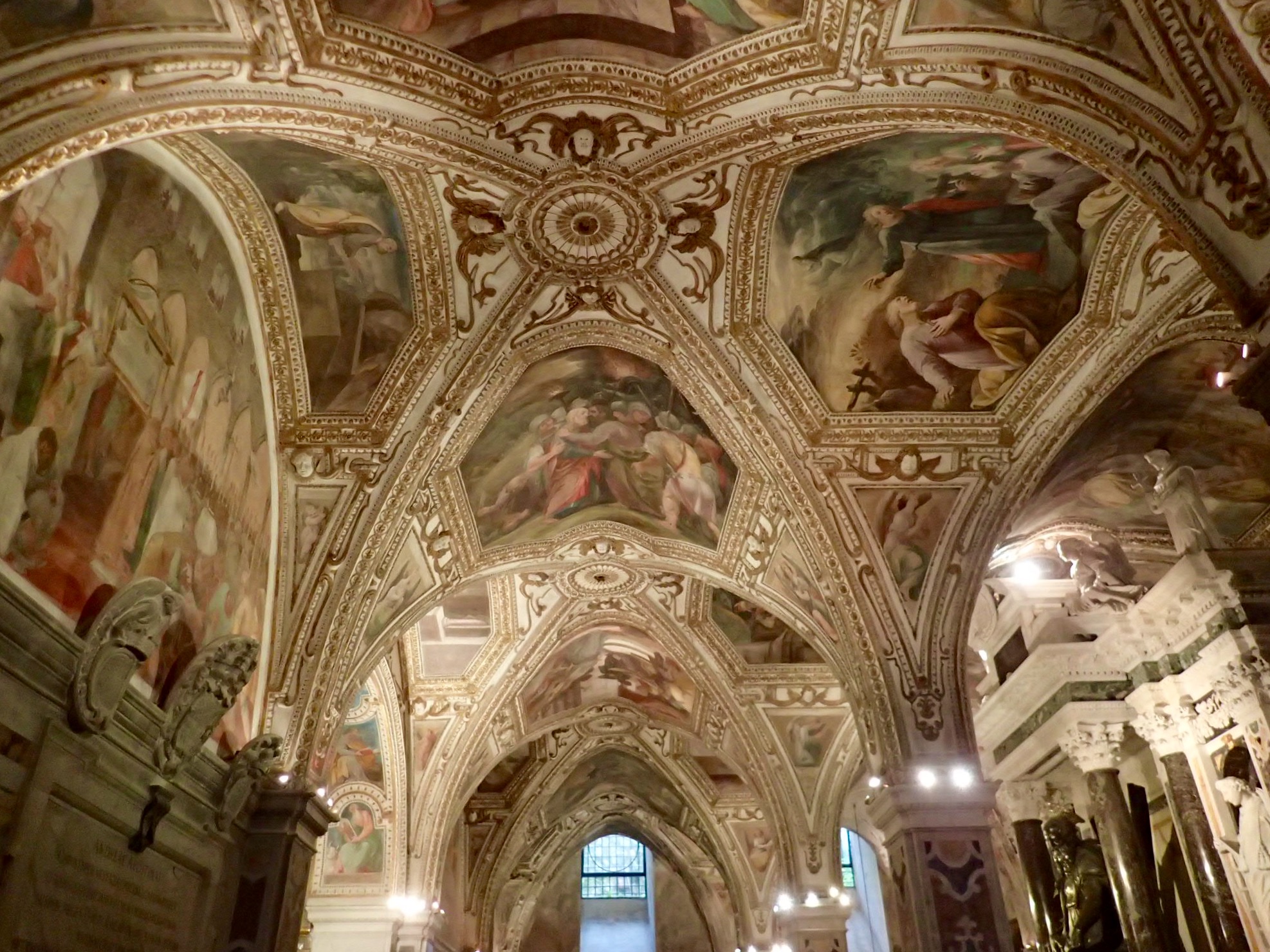 I visited Chiesa di San Michele Arcangelo (Church of St. Michael the Archangel). Built in 1719, it is octagonal in shape. The church’s floor has been cleared to allow for viewing its elaborate tiled image of the Garden of Eden. An angel with a sword chases Adam and Eve from Paradise while all of the the animals of the world look on bemused. Even a unicorn!