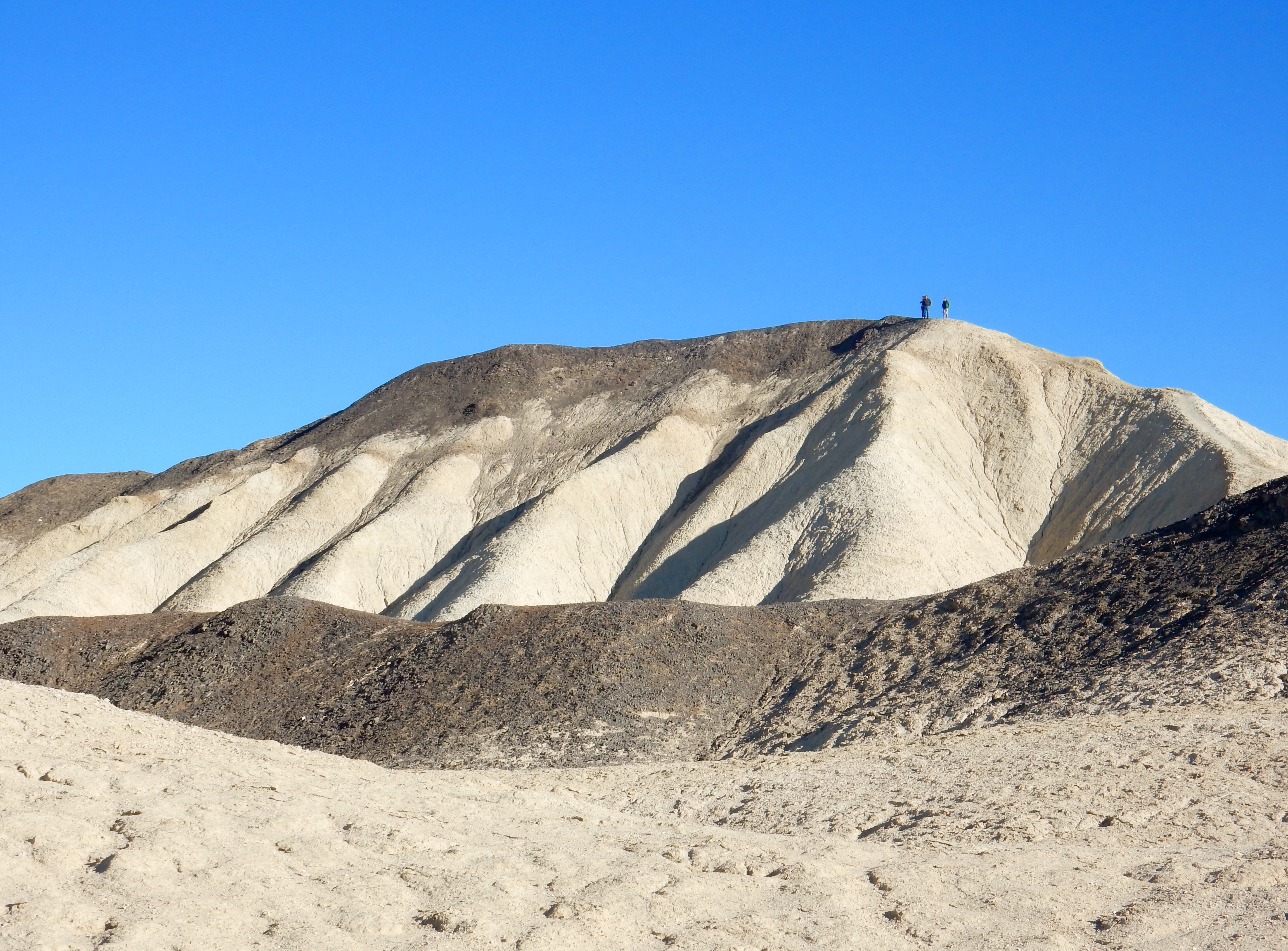 Dante’s View is just over a mile high. On clear days, the highest and lowest points in the contiguous forty-eight states can be seen: the Sierra Nevadas, including a not-quite visible Mount Whitney at 14,505-feet high, and Badwater Basin at -282-feet low. Across the valley is the Panamint Range, topped with snow.