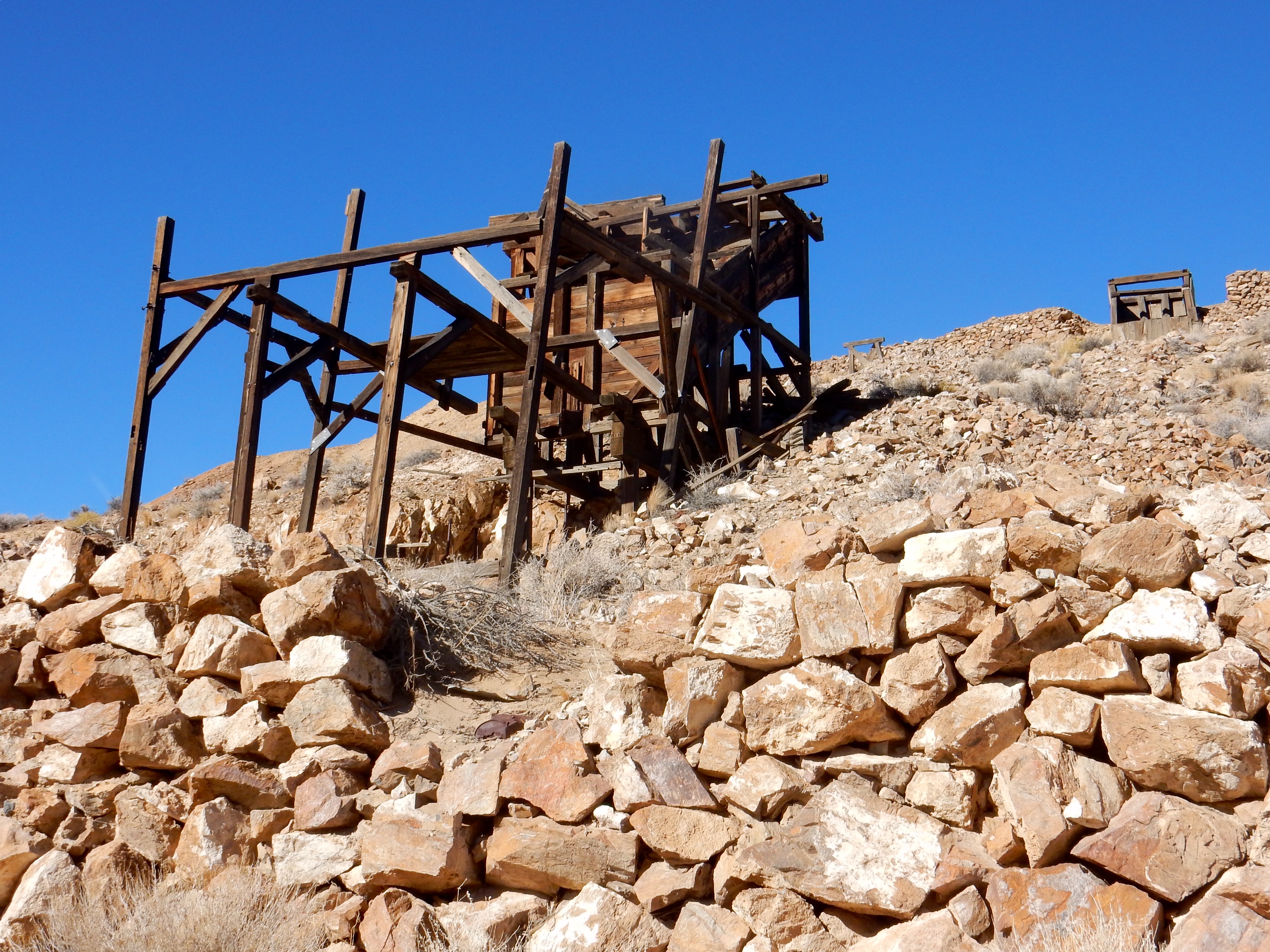 The Harmony operation was famous for its use of twenty-mule teams (eighteen mules and two horses) to haul refined borax out of the desert. The teams could pull up to thirty-six tons over 165 difficult miles. All that is left of the camp today is rusting machinery and stone foundations.