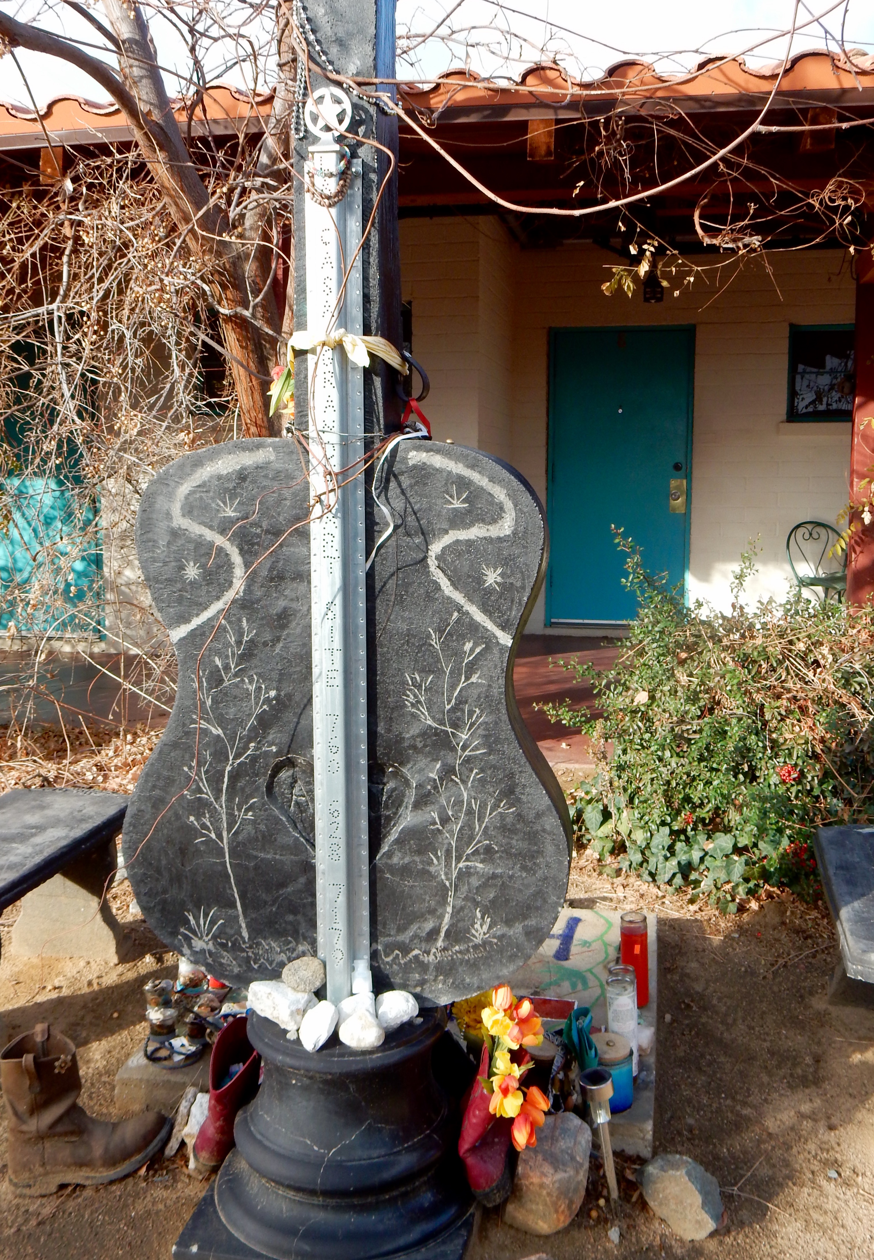 The lobby of the Joshua Tree Inn is decorated with his album covers and concert posters. In the courtyard outside of Room 8 is a memorial to Parsons—a guitar-shaped stone and a collection of tokens, including candles, guitar picks, cowboy boots, flowers, bandanas, incense, and so on.
