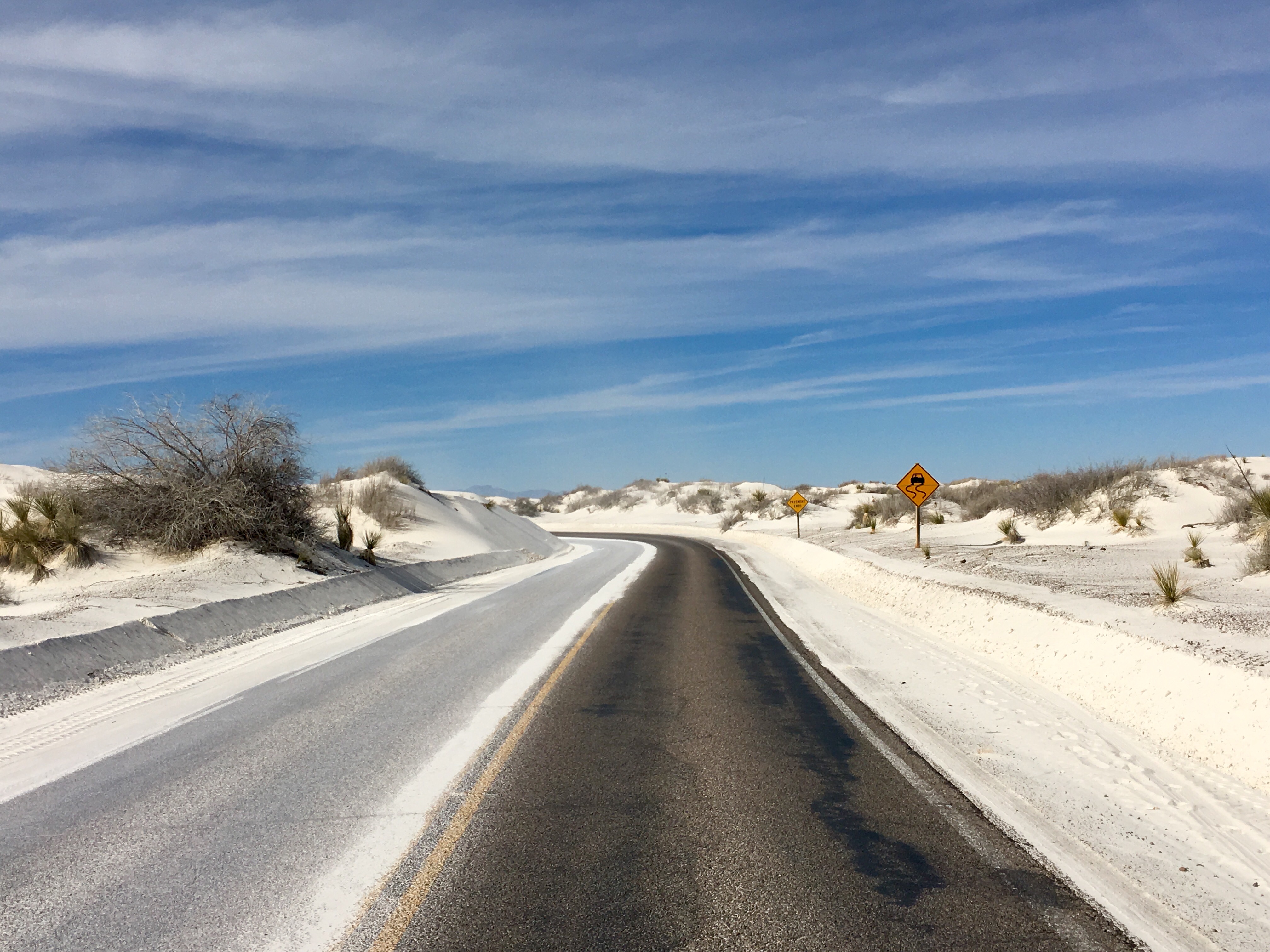 The sixteen-mile drive through the monument weaves between shifting mountains of sand. Once inside the dune field, all is white except for the sky. Sand drifts across the road and must be cleared daily with heavy equipment.