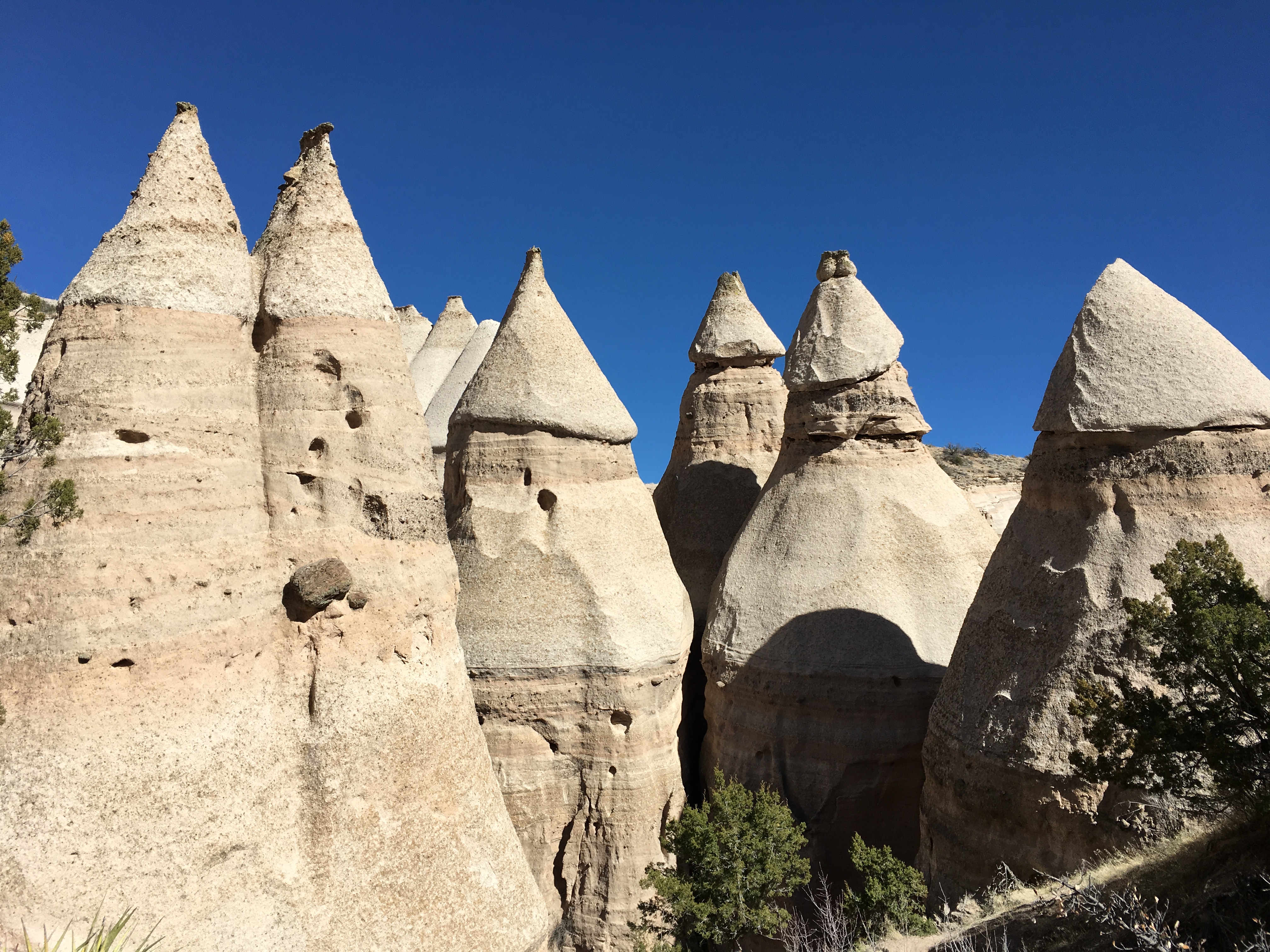 Further along the trail, the canyon widens and reveals a cluster of the namesake tent rocks. The tapered formations vary in height up to nine stories high. They look like giant traffic cones or the points of sharpened pencils.
