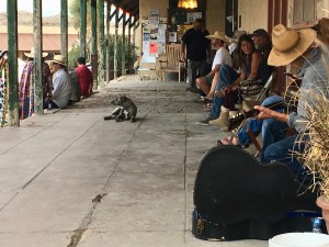 They watch as the sun transforms the Chisos Mountains from dusty brown to glowing orange and pink. An old cowboy in a straw hat strums and sings “El Paso.” Dogs wander up and down.