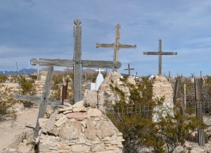 They are buried above ground under piles of rocks because the earth is too hard to dig. The sites are marked with simple wood crosses, most of which have fallen over.