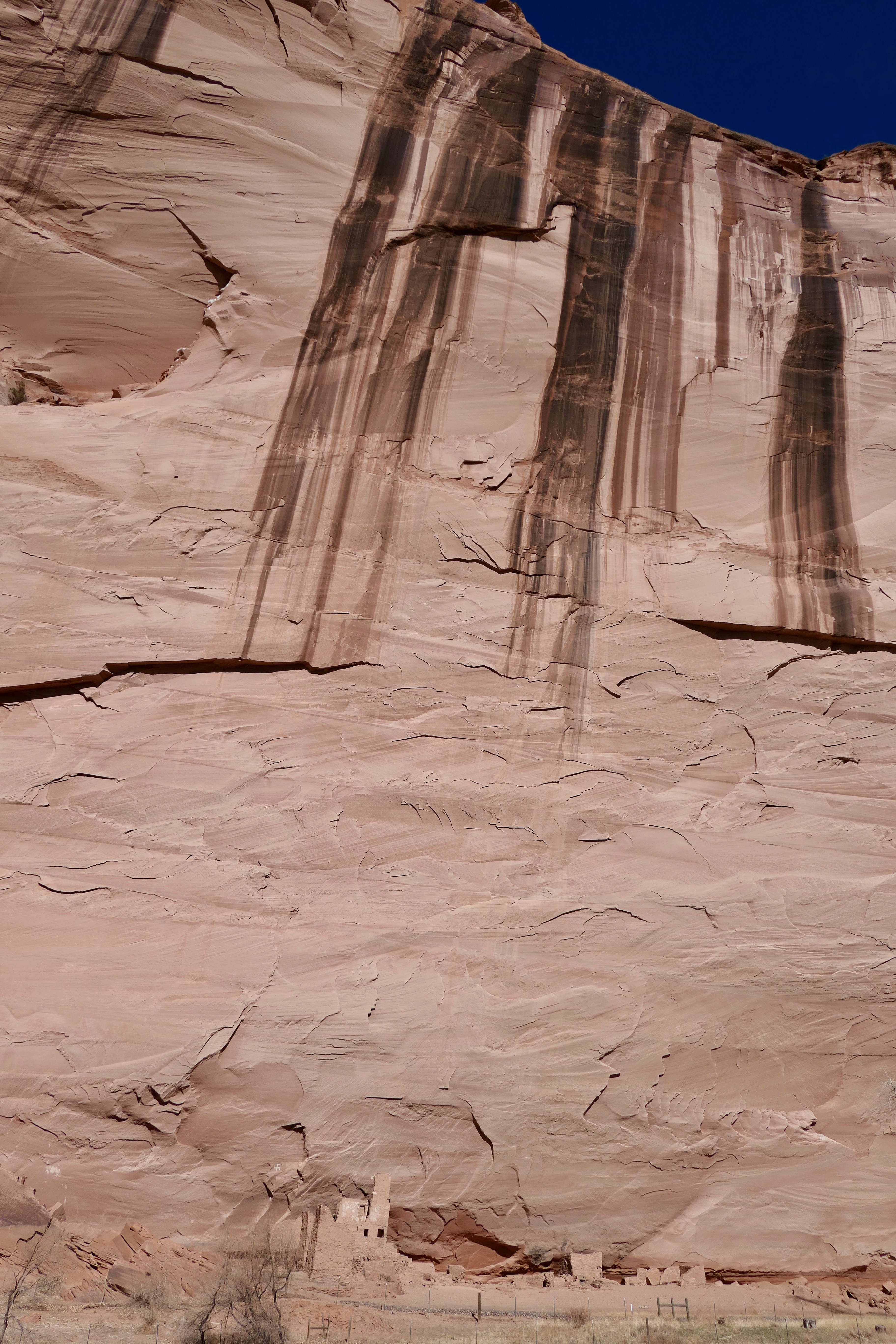 The sheer sandstone cliffs have weathered in layers, leaving soft, swirled edges. The reds, yellows, and oranges are muted. Dark streaks of desert varnish drip down the walls. Fissures in the rock provide cover for ancient stone dwellings, which are often hard to discern.