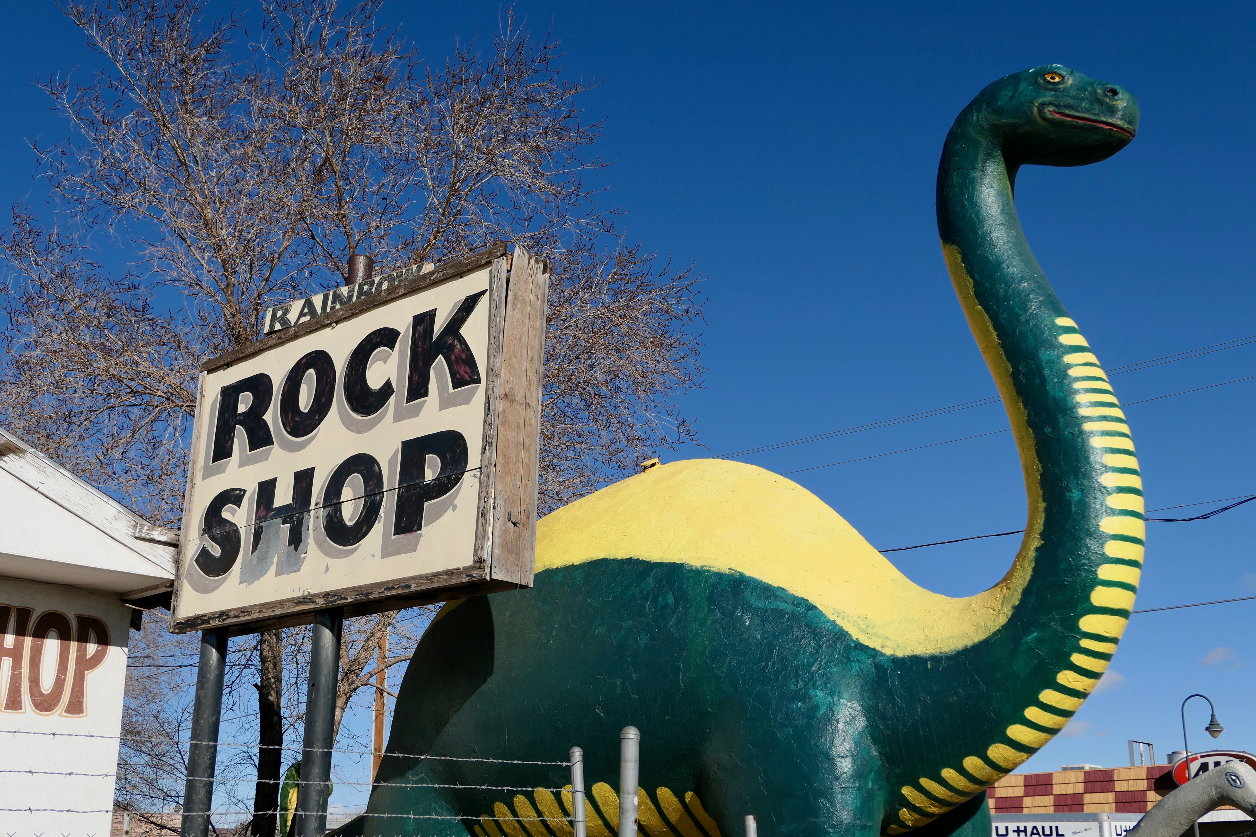 The streets of nearby Holbrook are lined with additional remnants of Route 66’s heyday, such as the kitschy Wigwam Motel and its concrete tepee-rooms. Statues of dinosaurs guard piles of petrified wood in front of numerous rock shops.
