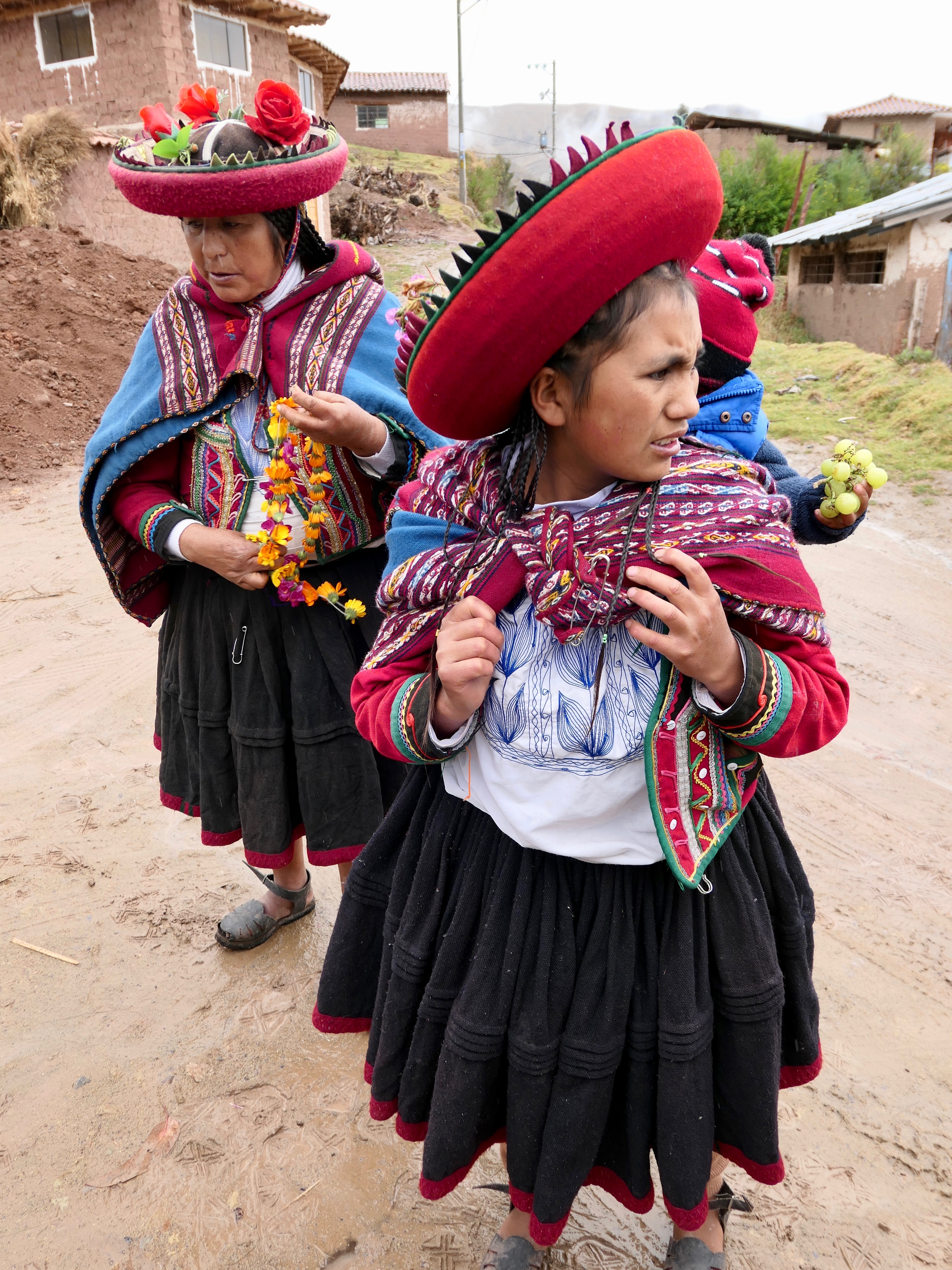 They giggled while dressing us in local outfits—ponchos and chullos (knit hats) for the men, monteras and llicllas (capes) for the women. The textiles were handwoven with intricate designs and colors unique to the village. Local produce, including potatoes, quinoa, and beans, was proudly displayed
