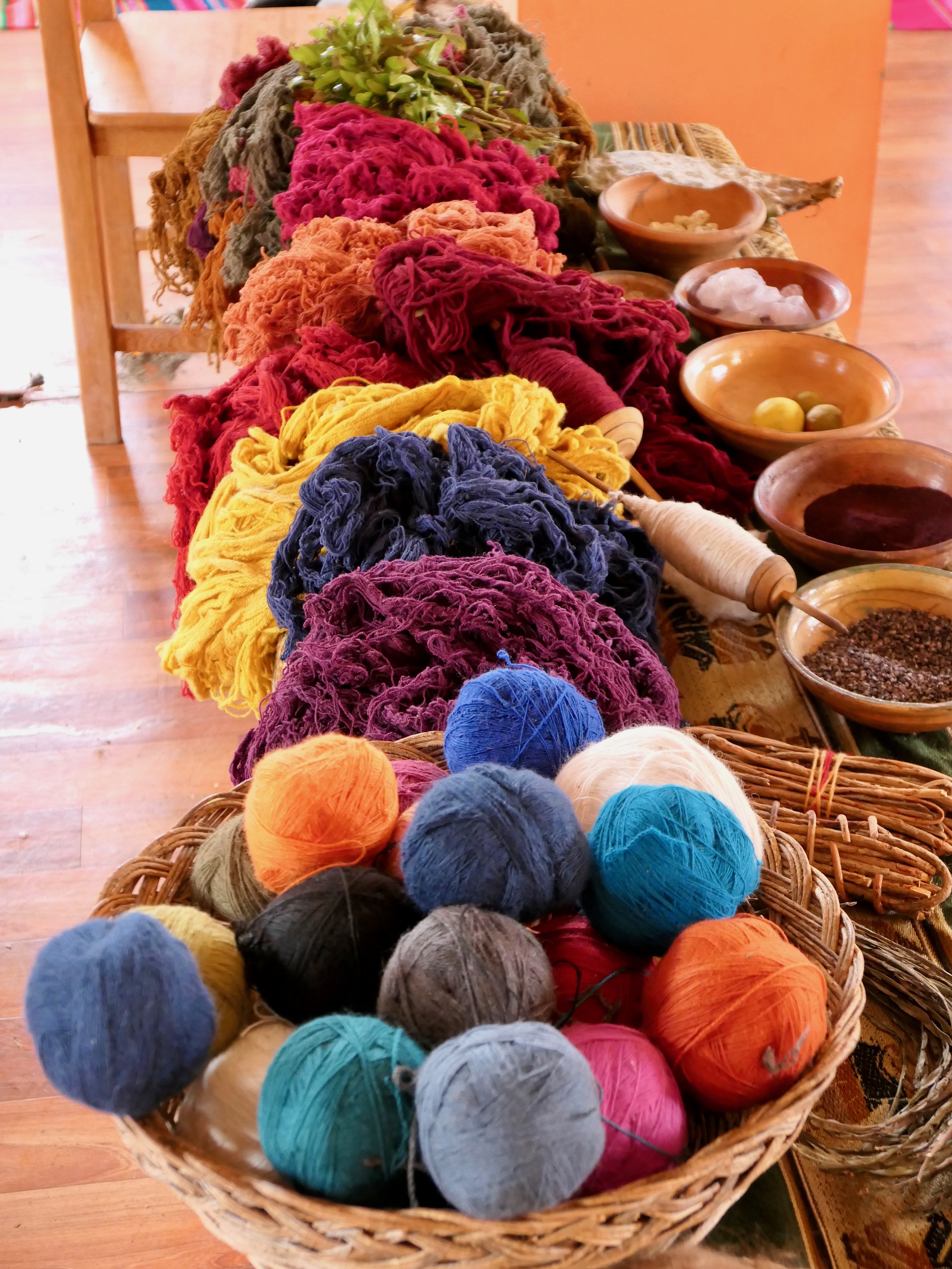 At a long wooden table, they served lunch—chicken soup, quinoa cakes, veggies, and coca tea. Afterward, the women identified the sources of the natural dyes they use. They demonstrated how they wash wool, spin it into yarn, and weave their products.