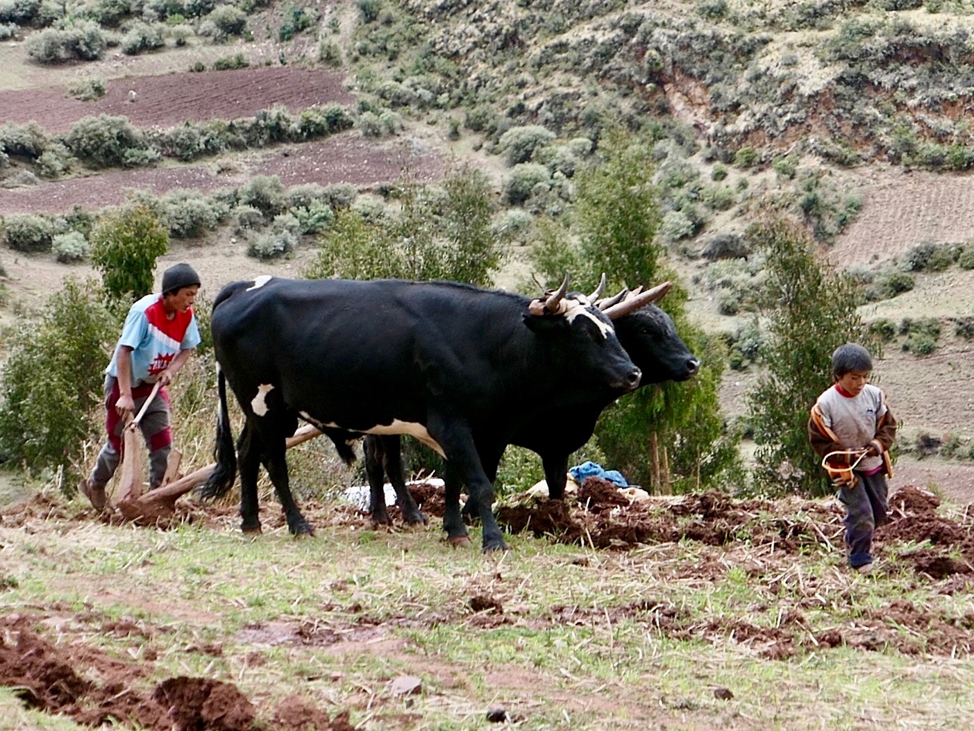 We climbed higher, through more steep farmland, passing a man plowing a field with two oxen. Back to the Stone Age. Dogs roamed freely. Hogs rooted in the mud.