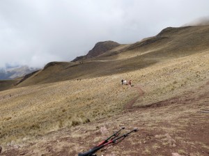 We headed onward through steep tree-less meadows to the second pass, Kuychicassa. One by one, we reached the summit, a grassy knoll. We congratulated each other. The pass tops out at 14,600 feet, our highest elevation on the hike and a mile higher than Machu Picchu.