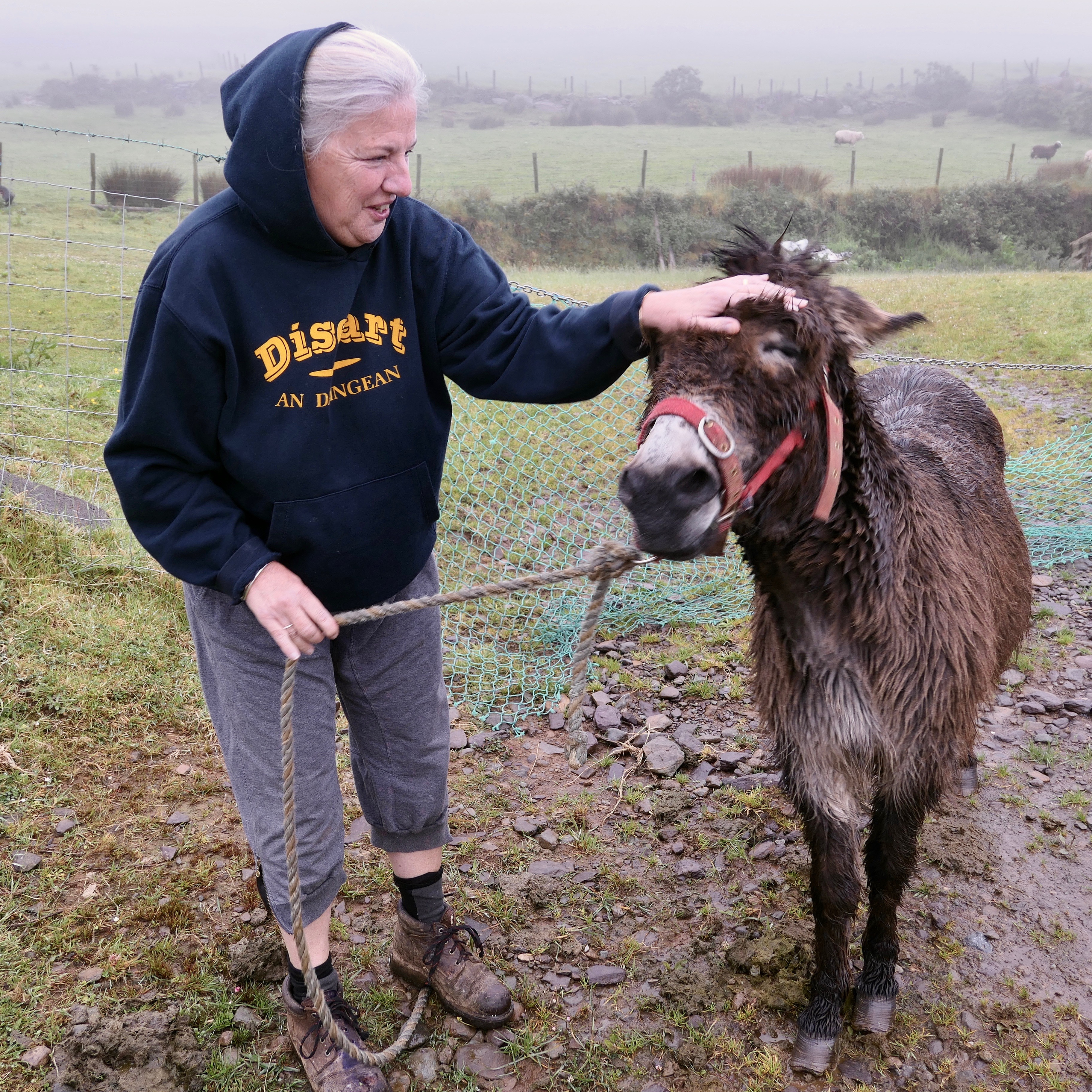 On several farm roads the mud was ankle-deep. The views to the ocean and the mountains would have been spectacular if not for the mist. We visited with a farmer and her pet donkey, Miley, somewhere in the clouds near Lisdargan.
