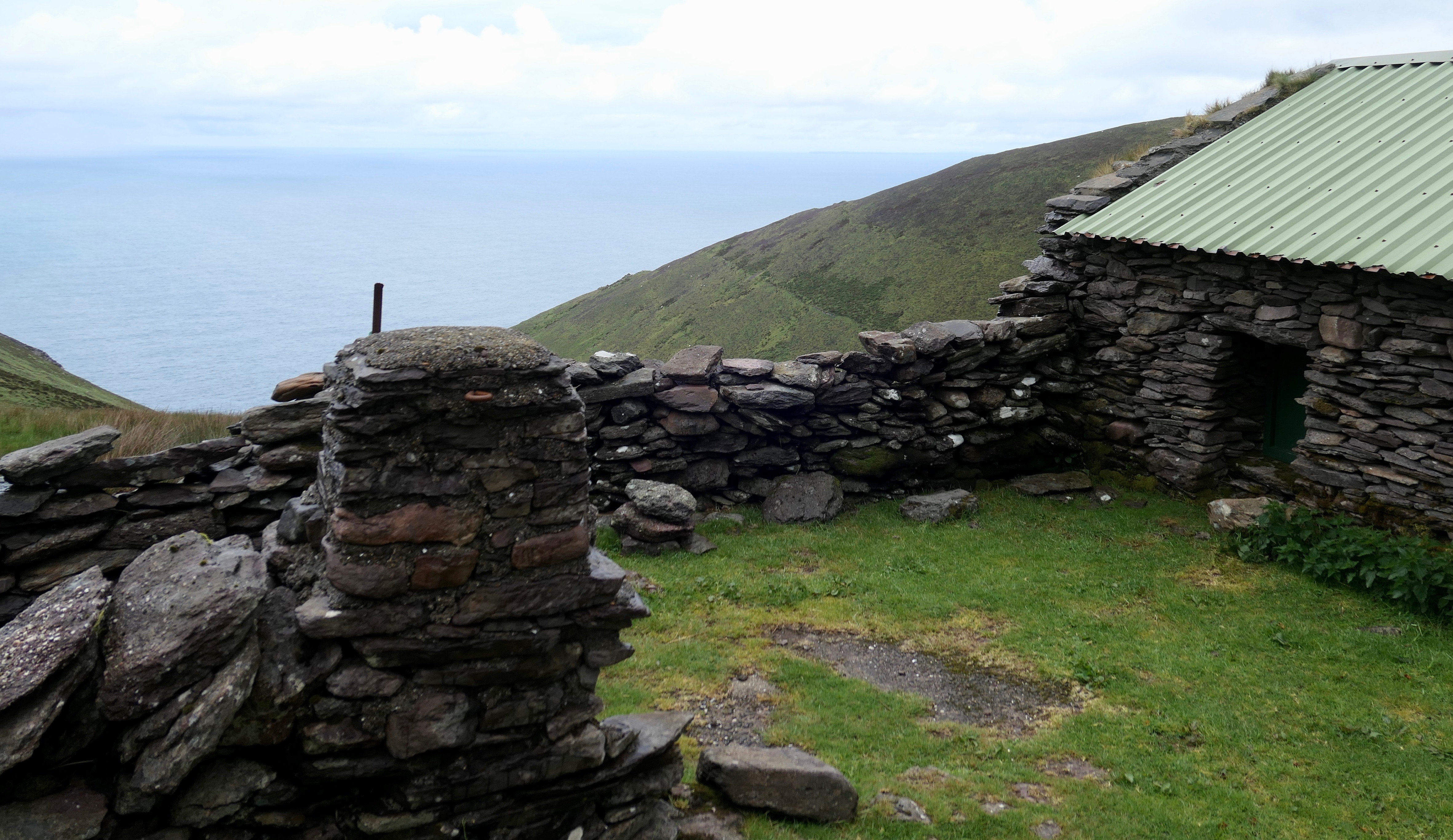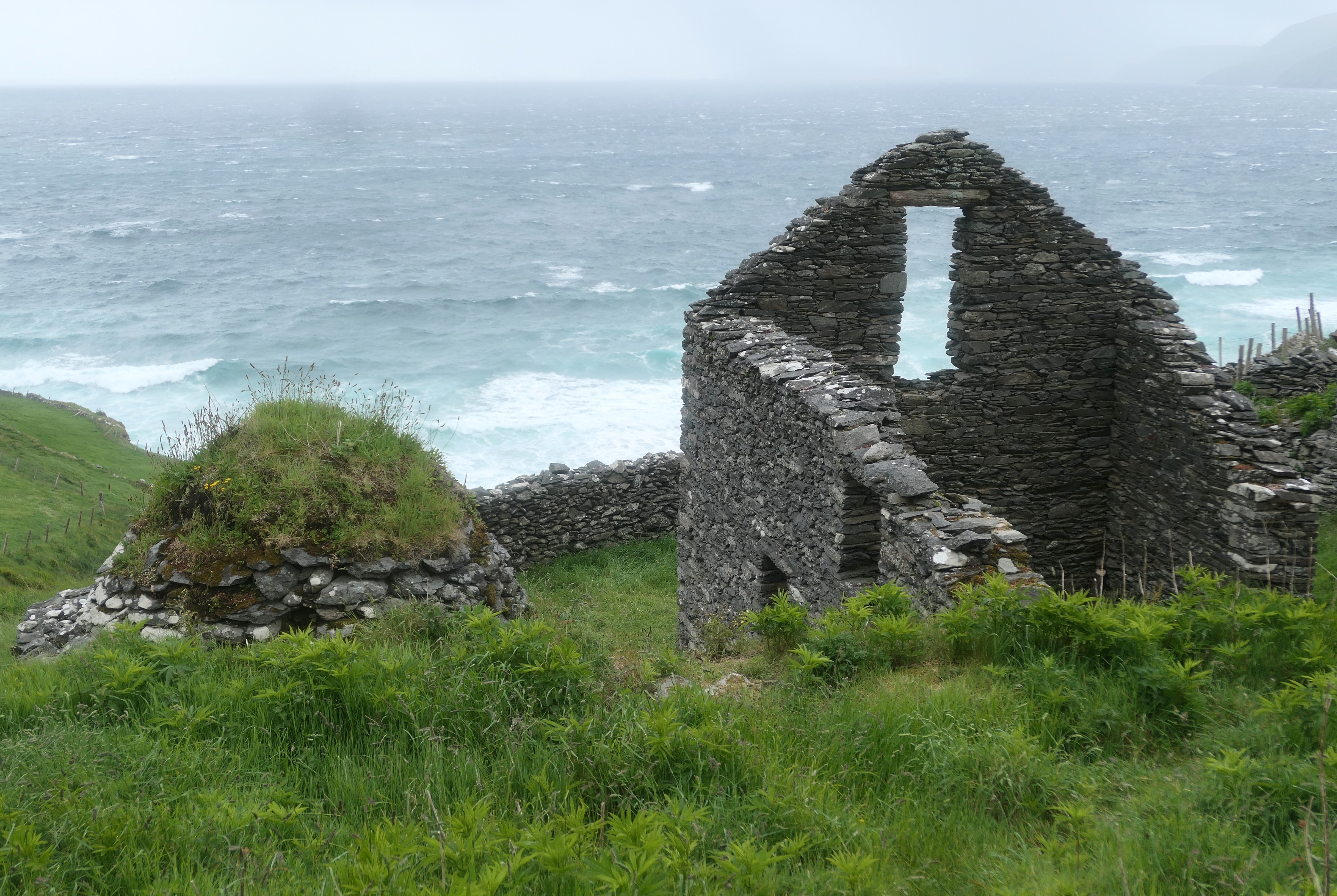 On the horizon are the uninhabited Magharee Islands, also known as the Seven Hogs. In the summers, farmers used to swim sheep and cattle to the islands during low tide for grazing. A few beehive huts are located on one of the islands.