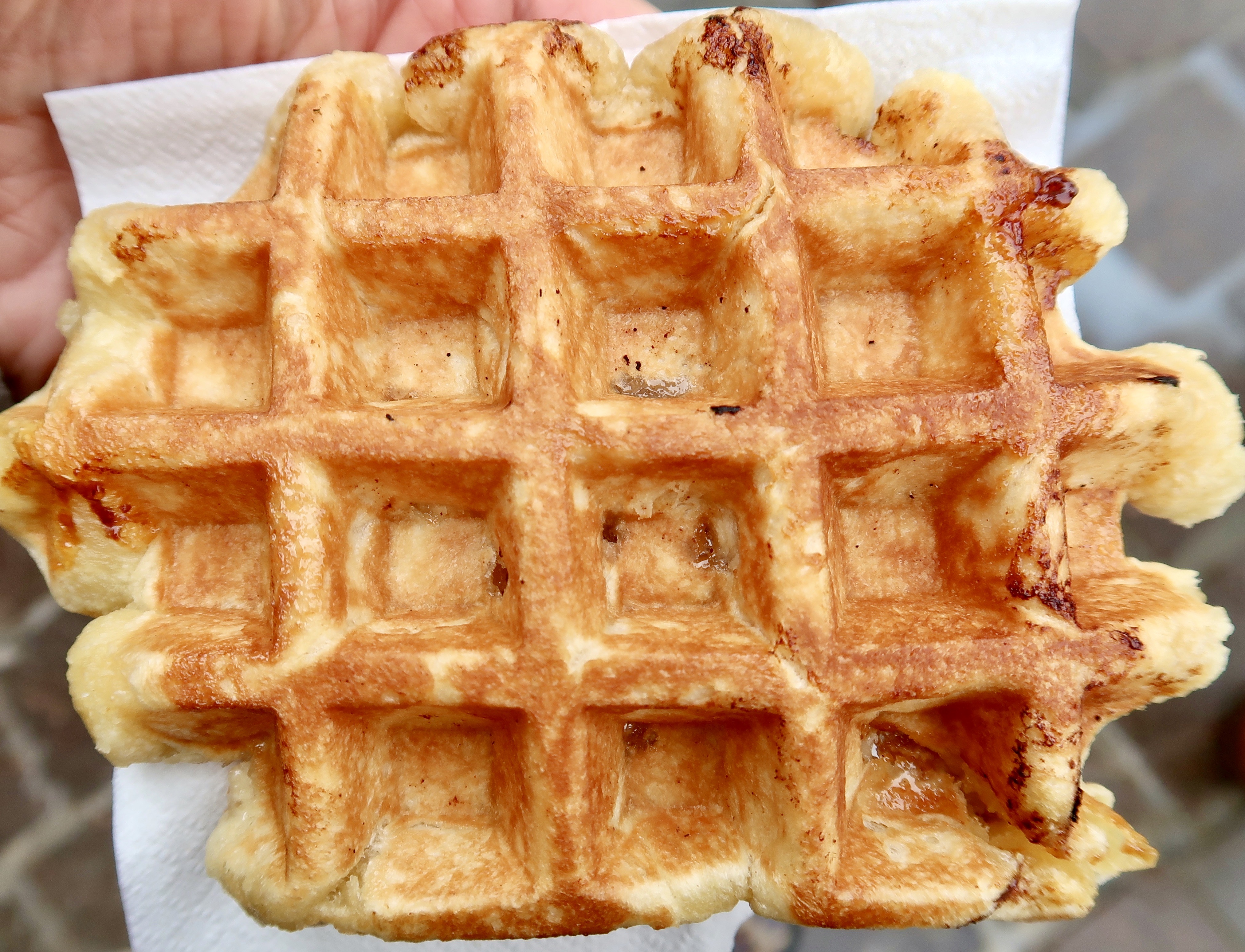 Waffles are another mainstay of Belgian street food, served hot from stands everywhere. The style known as Liège is dense and sweet. Pearl sugar, which does not melt in the iron, gives the waffles a crunchy texture. Tourists eat them with toppings, such as whipped cream, jam, or chocolate syrup, while locals prefer them plain.