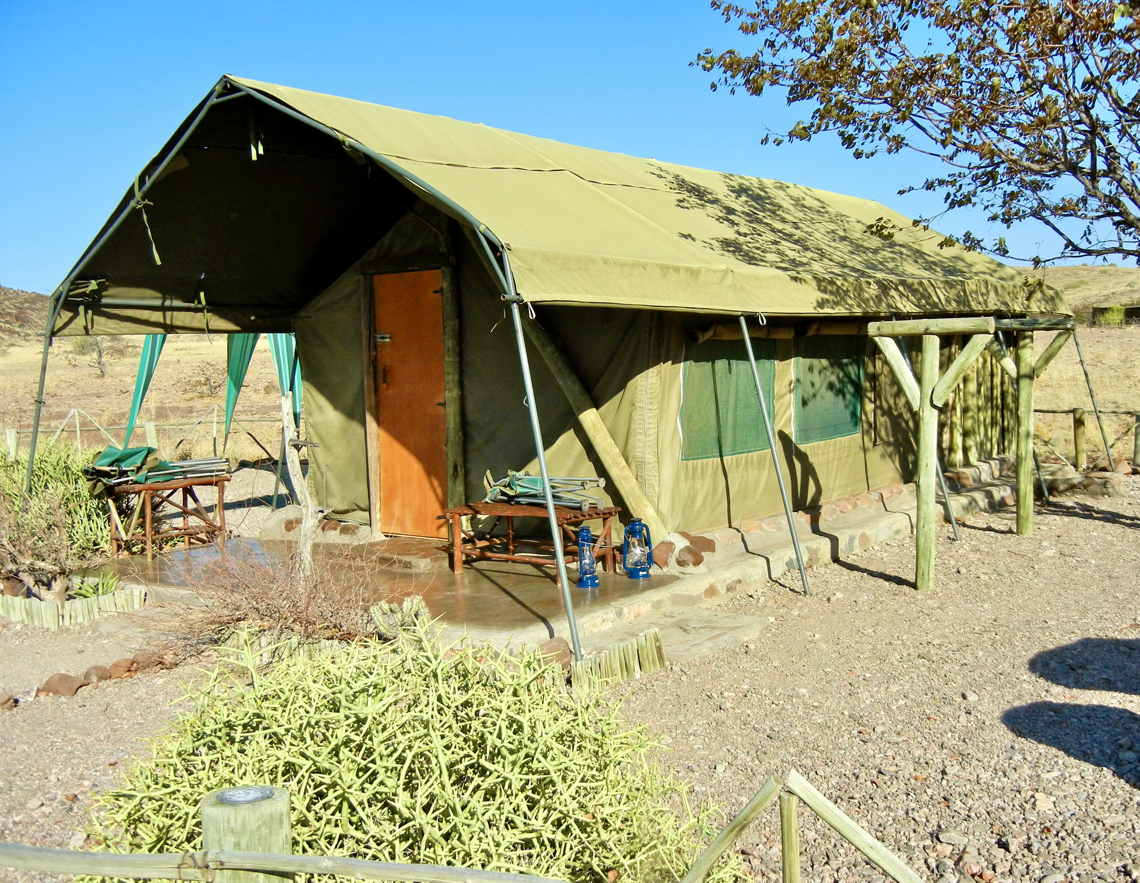 The tent floor is concrete; the walls canvas. No electricity, but each evening we found two lit oil lanterns on our front porch, glowing pleasantly in the dark.