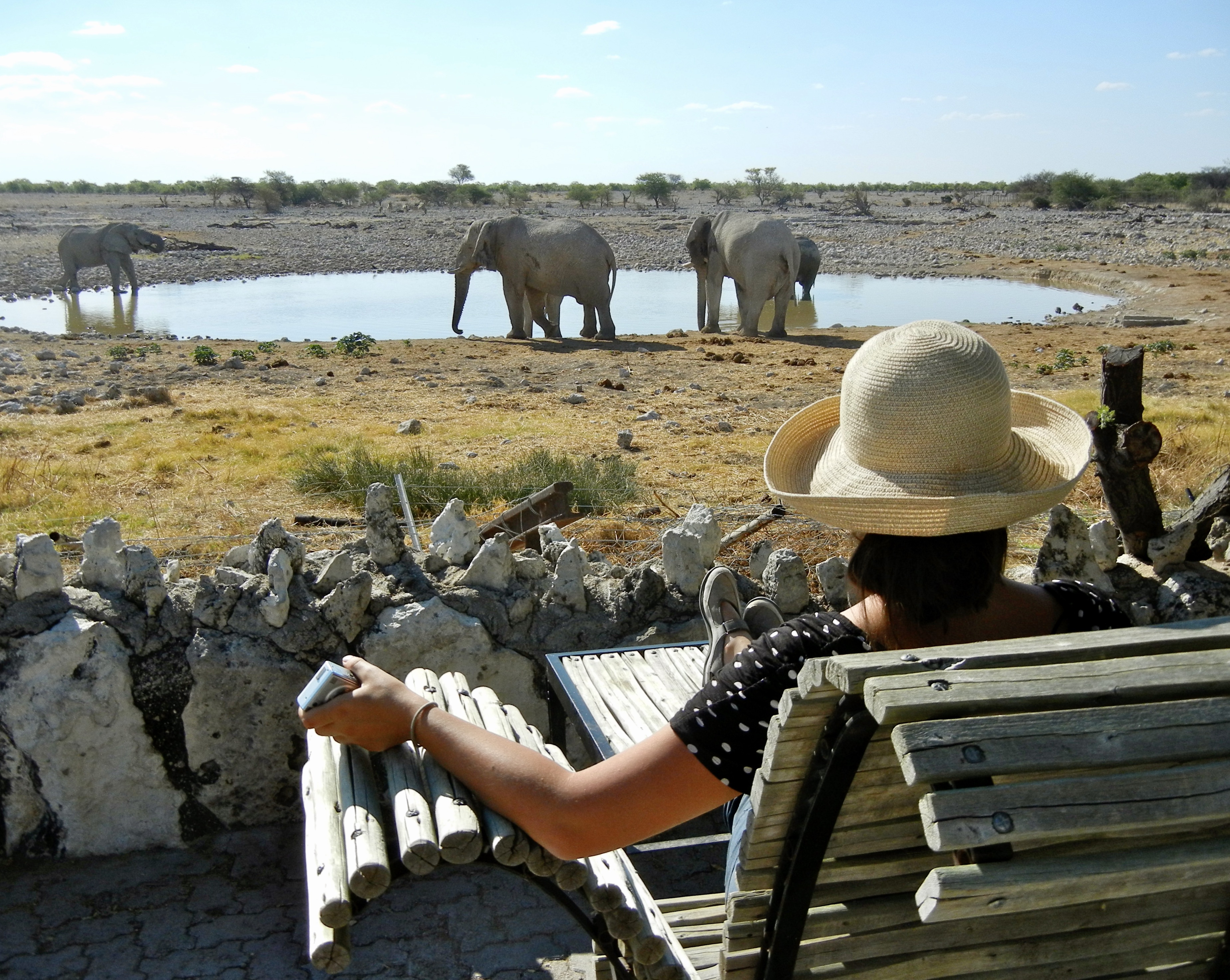 We passed through the settlement of Otjikondo, Namibia, and entered Etosha National Park mid-afternoon, immediately spotting giraffes and zebra. The ice-cream truck had a soft tire, so Trompie and Danny left us at the Okaukuejo waterhole while they sought to have it repaired.