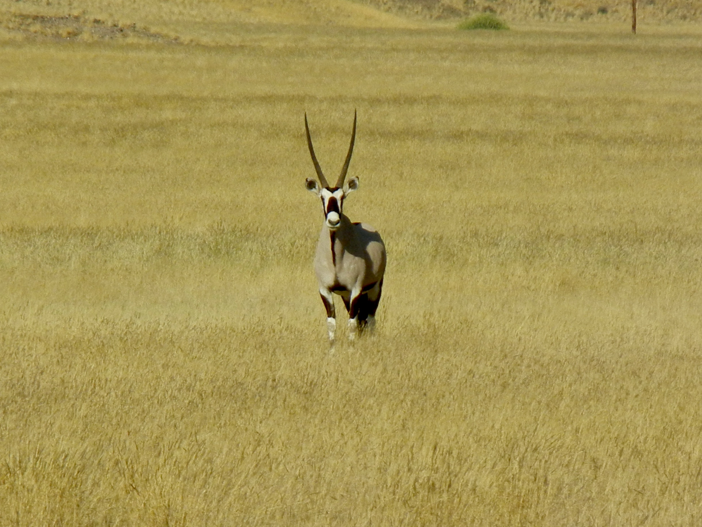 After leaving camp the next morning, we spotted several animals in the wild—ostriches, black-backed jackals, helmeted guineafowl, a tawny eagle, a strutting secretarybird, a southern black korhaan (another species of bird), and numerous antelope, including springbok, blesbok, kudu, and a stately oryx that stared us down.