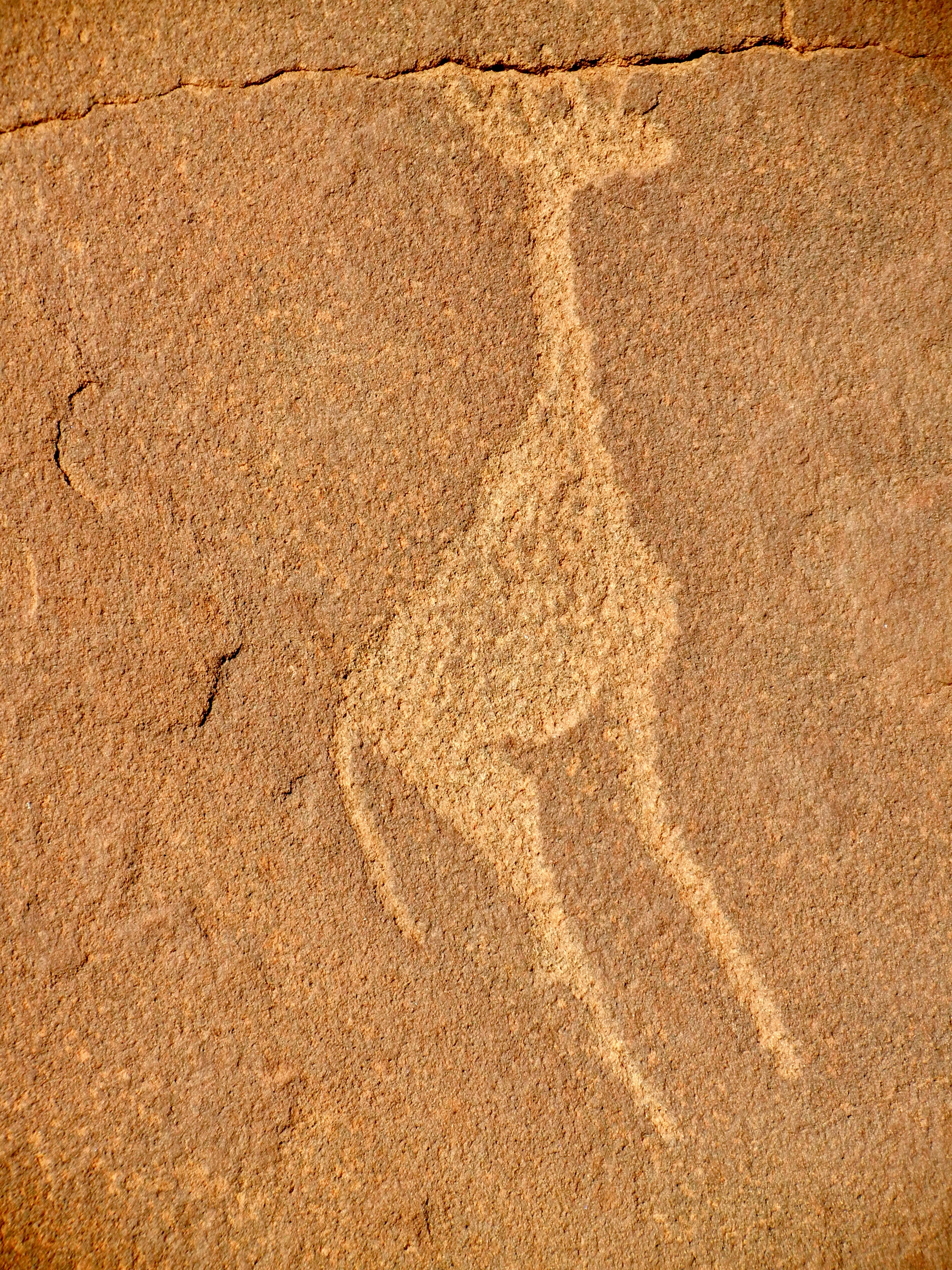 A young local guide led us through the talus field, stopping to point out various carved images. Many of the petroglyphs are of animals—elephants, rhinos, giraffes, zebra, antelope, ostriches, and flamingos. Sea creatures, including seals, dolphins, and penguins, are also represented. The San encountered them when visiting the coast, some sixty miles away.