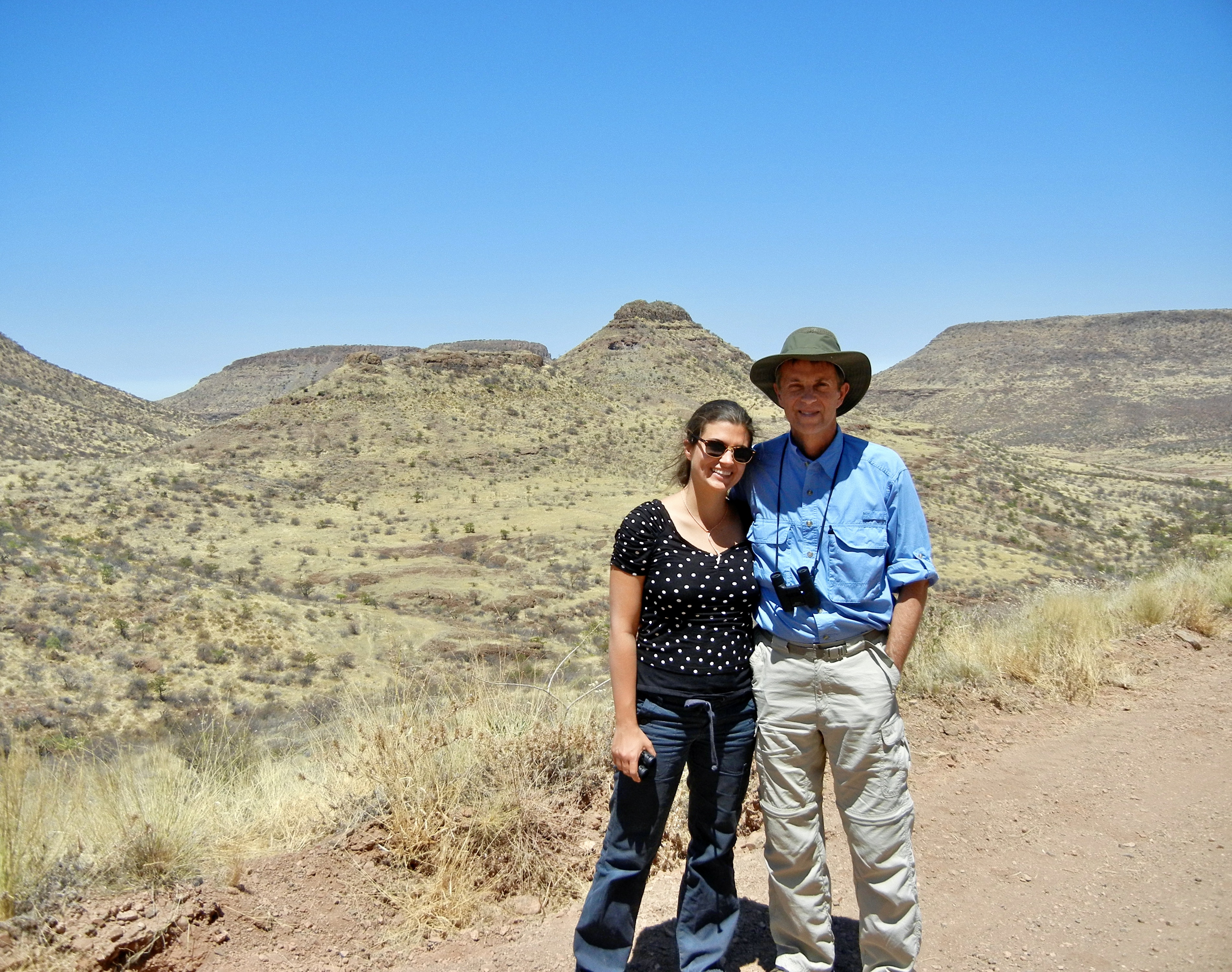 At Trompie’s suggestion, we climbed a nearby hill overlooking the camp. Our remoteness is genuine. We could see hundreds of miles in every direction and not a sign of humanity except a single dirt road. The landscape is desolate, all yellow and brown. At sunset a herd of wild donkeys sauntered by.