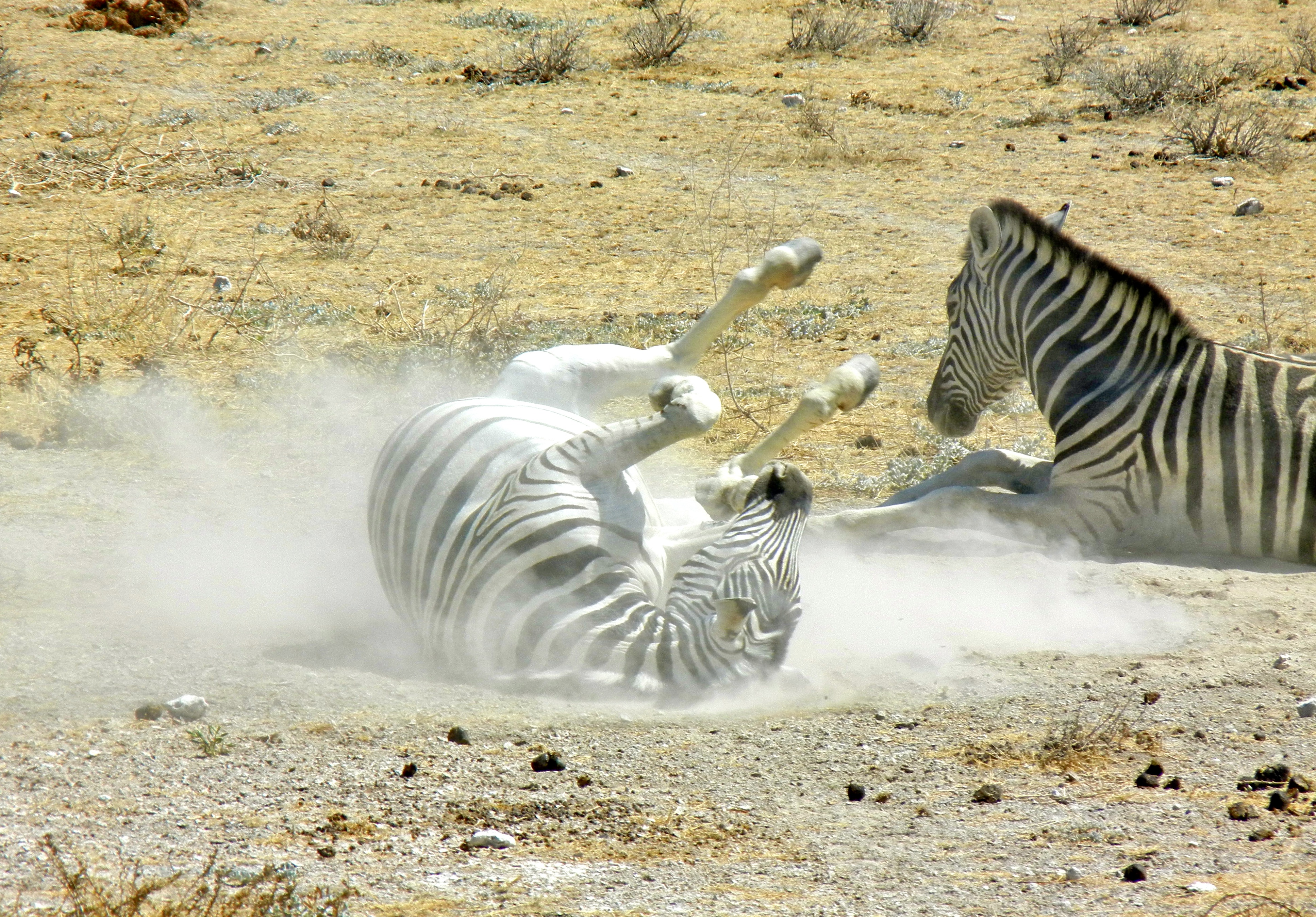 At the Rietfontein waterhole, three herds of elephants, including several babies, submerged themselves in the muddy water to cool off. Zebras bathed in dust by rolling on their backs and kicking their legs in the air. After lunch at Halali Camp, we parked the ice-cream truck and walked out onto the Etosha pan.