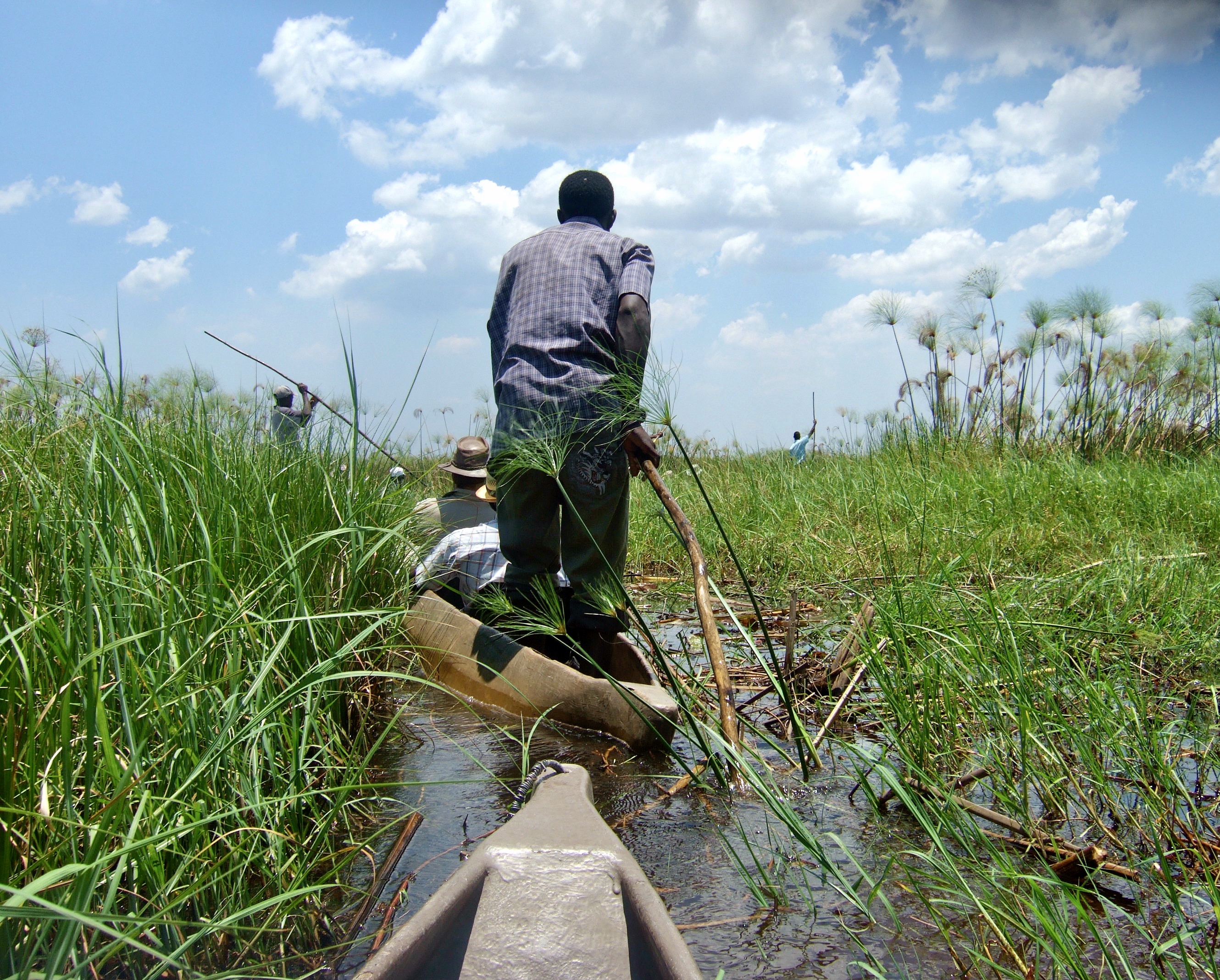In the morning, the speedboat took us back to Sepupa. From there, a truck drove us through several villages until we reached another shore of the delta. A group of local men waited in the mud next to long, slender mokoro boats.