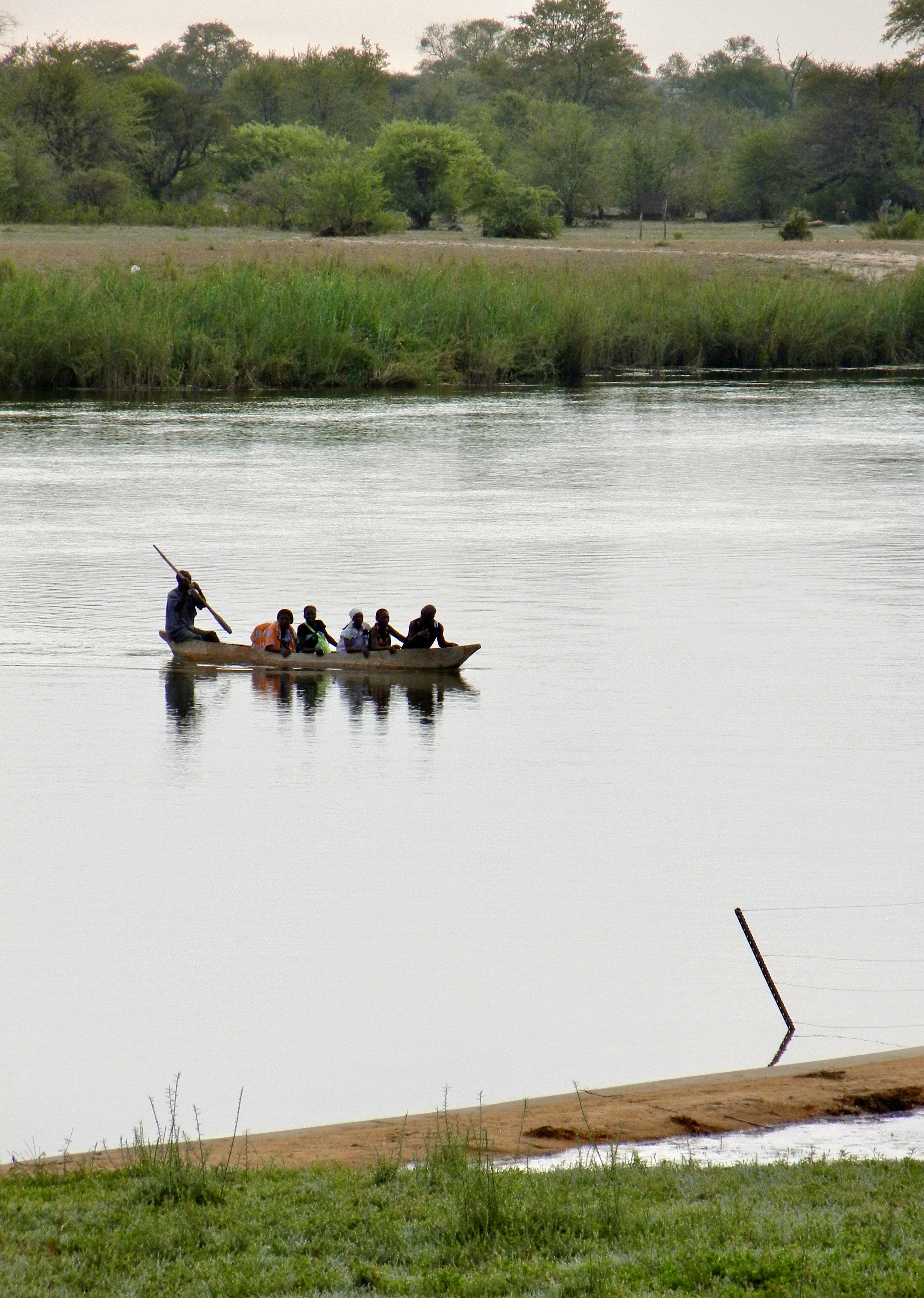 We checked into the Kaisosi River Lodge on the Okavango River between Namibia and Angola. Our hosts served us drinks made with lychee fruit on a deck overlooking the river, while we watched people crossing the border illegally by boat. Supposedly they were headed to their jobs in Rundu.