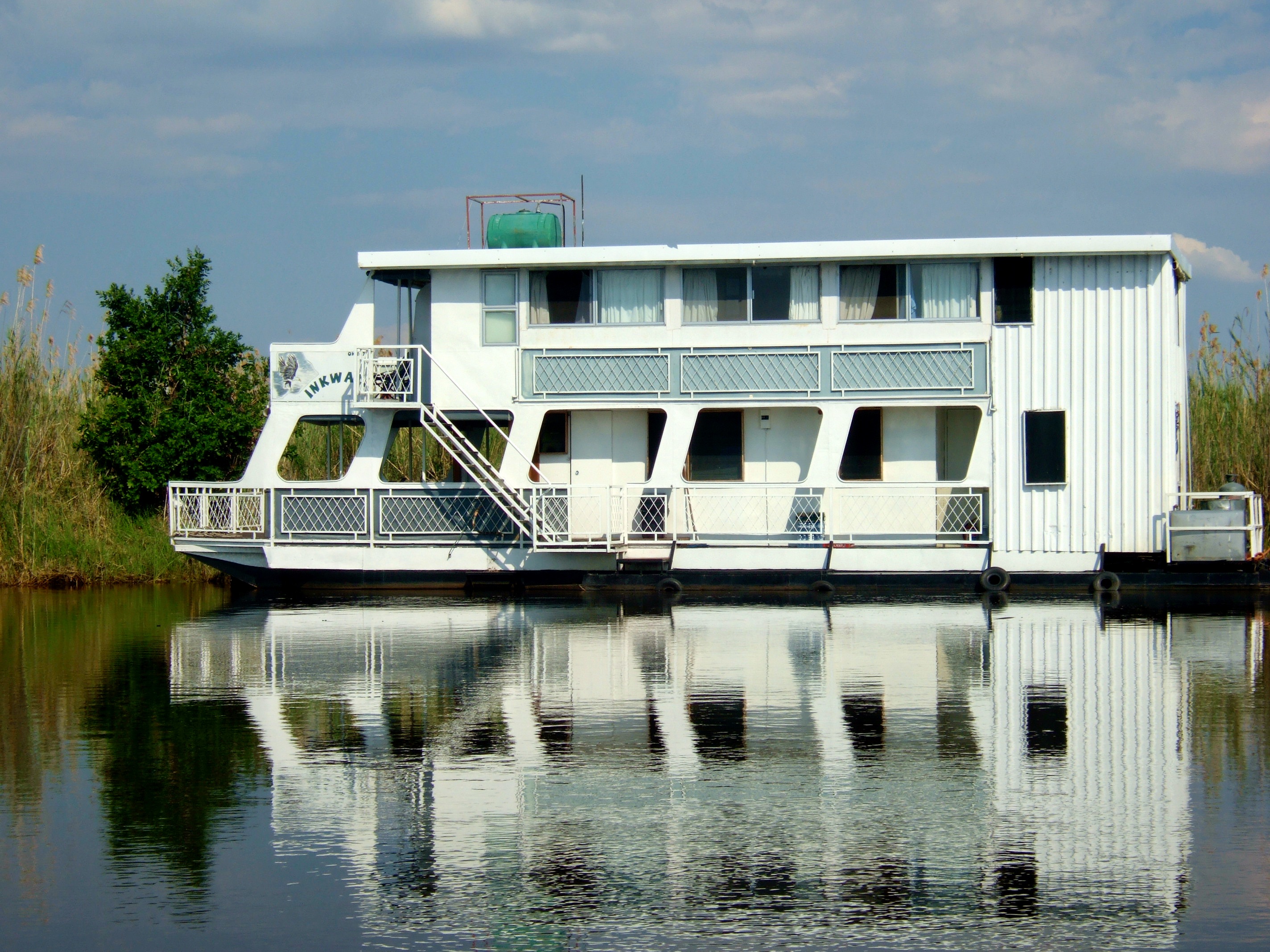 As we sped down the river, African fish eagles watched us from tree branches. We startled a hippo and several crocs. Danny spotted a monitor lizard on shore. At a bend in the river, Inkwazi was waiting for us. The houseboat Inkwazi would be our home for the next two nights.