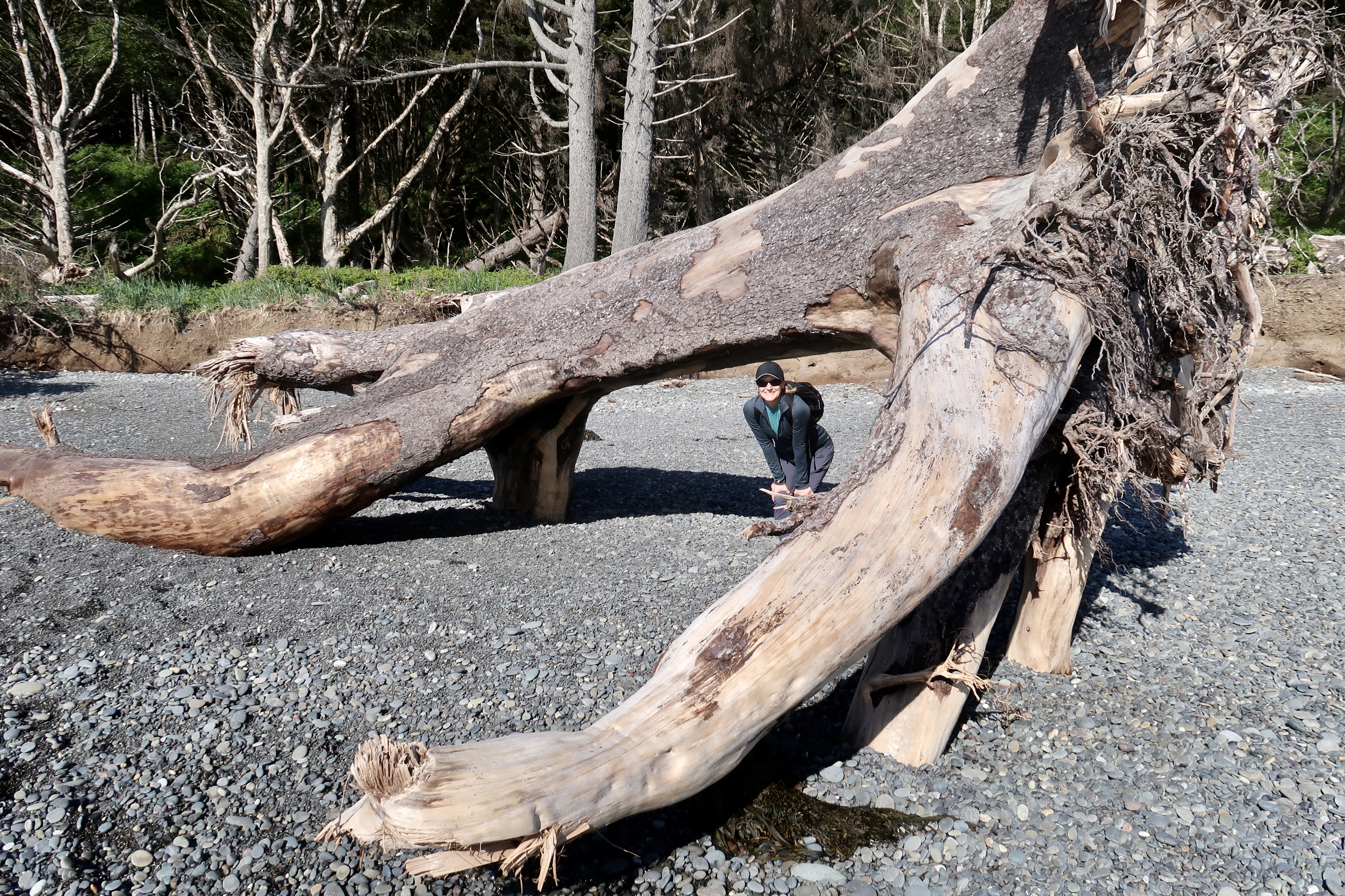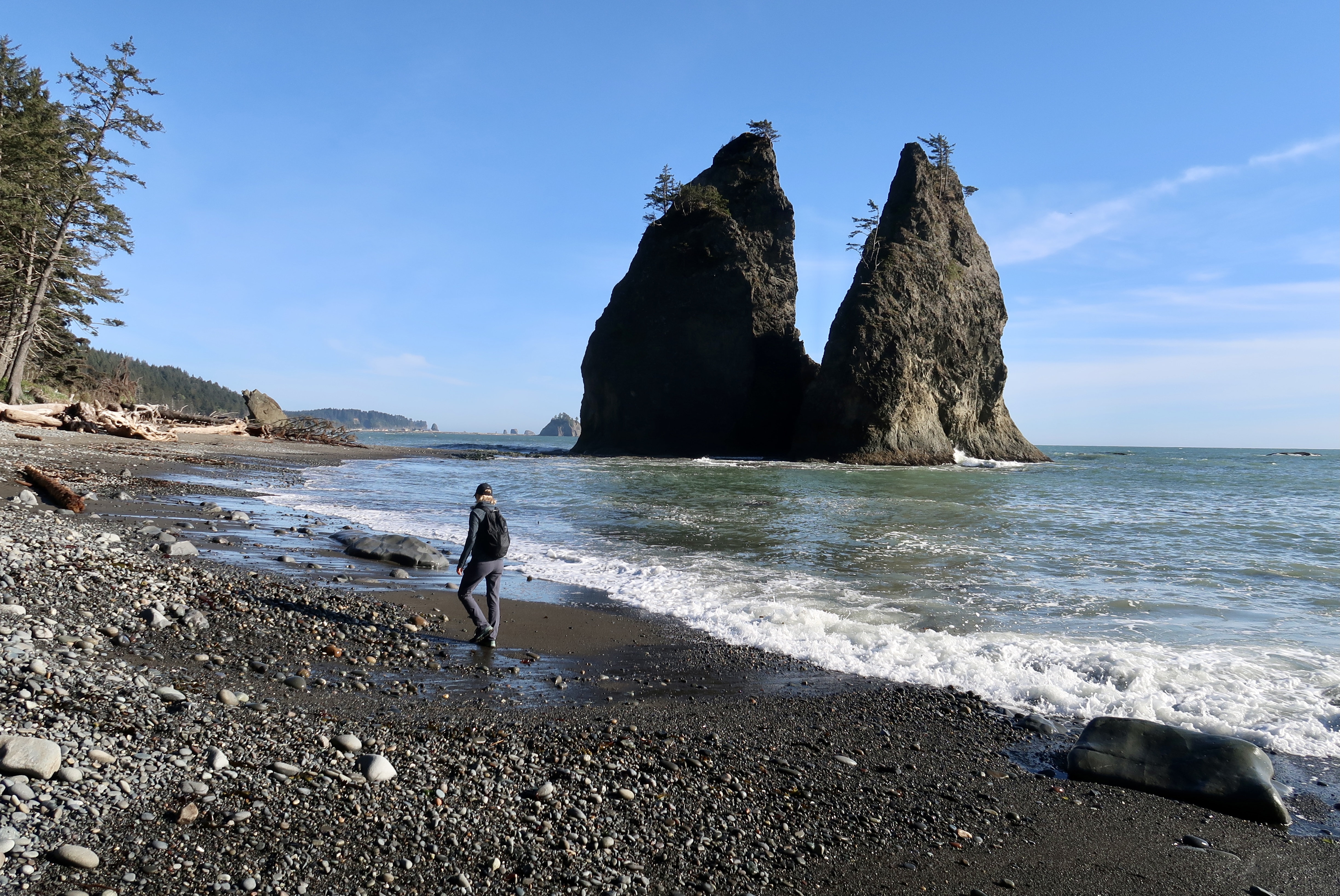 We headed first to the west side, where the park includes sixty-five miles of wild Pacific coastline. The rugged beaches are strewn with boulders and driftwood. Sea stacks punctuate the horizon.