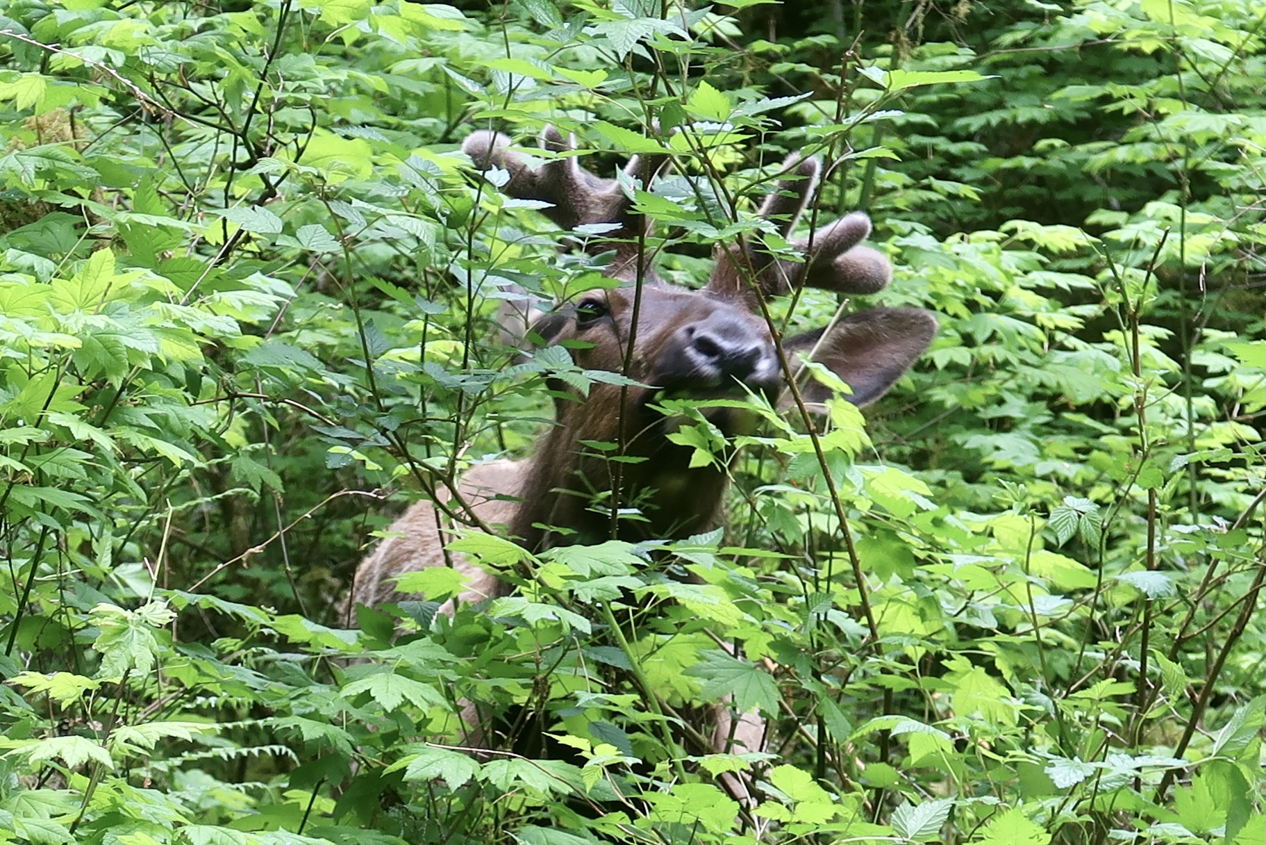 Then, on our way back to the visitor center, we passed a male Roosevelt elk calmly munching leaves just ten feet from the trail. Before beginning the hike, we read a notice at the visitor center warning hikers to be alert for aggressive elk. Bulls may grow to 5½ feet in height and 1,100 pounds in weight.