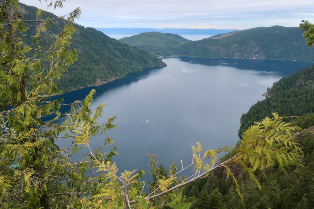 At the top of the roped sections, Leslie continued to scramble up the rocks to the promontory, just a few feet above. Instead, I rested. After the long climb, my knees were too shaky to navigate the sideways slant of the scramble. One misstep would have sent me over the side. At the top Leslie enjoyed a sweeping view of twelve-mile-long Lake Crescent and the Strait of Juan de Fuca.