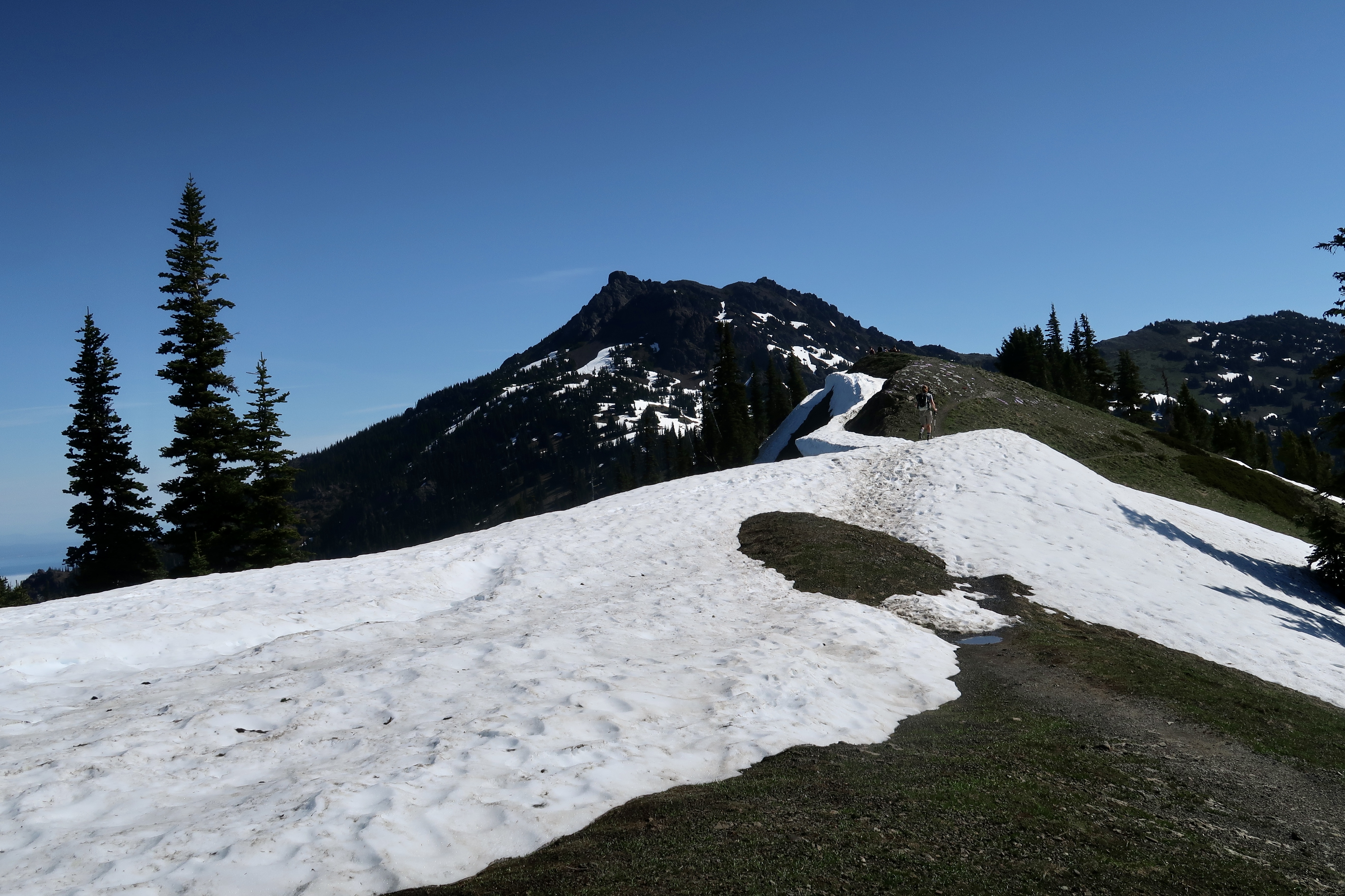 Again the next morning, we were the first to arrive at Hurricane Ridge. We waded up the snow-covered ski slope to the High Ridge Trail and followed it to Sunrise View Point. Then, below the view, we joined the Hurricane Ridge Trail toward the 6,454-foot Mount Angeles.
