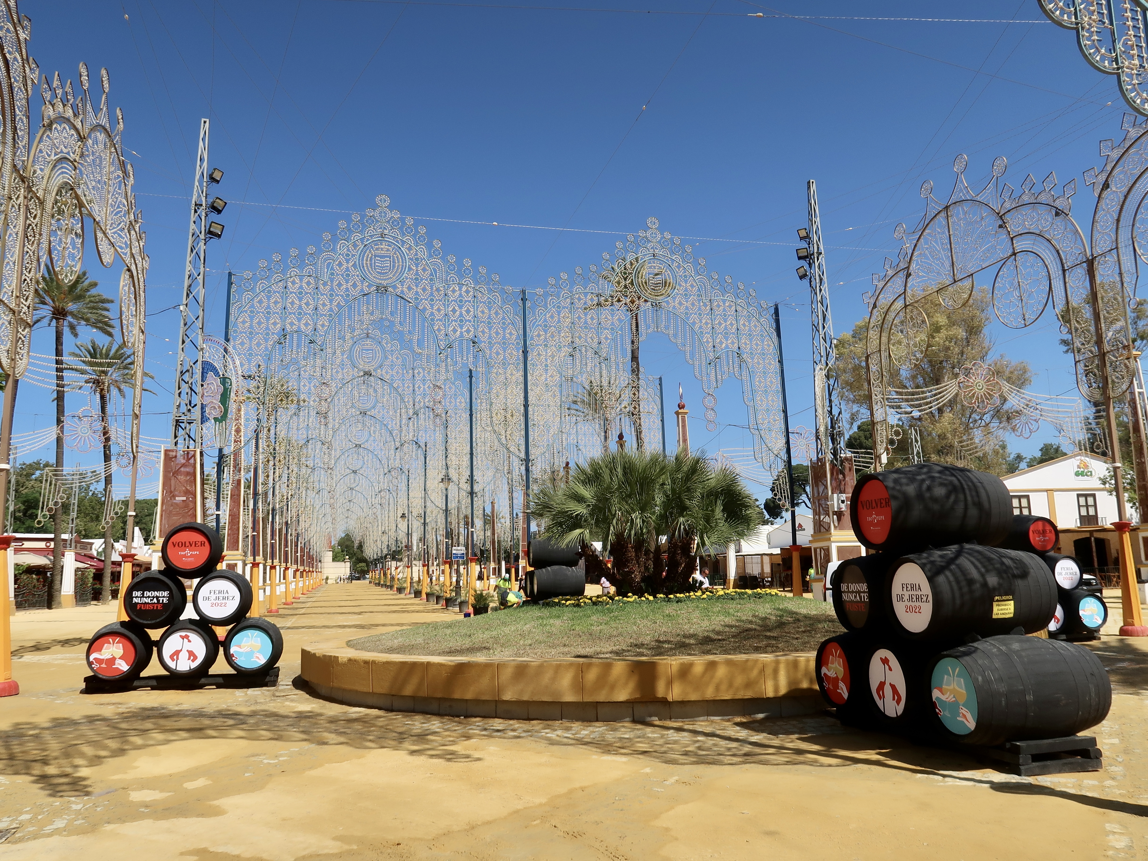 We arrived too early. The Feria del Caballo, the horse fair, was only just setting up. The festival dates to 1284. We walked the grounds of the park as two-hundred-plus food stalls began prepping for the day. Overhead were elaborate lighted arches. Trucks sprayed water on the sand to tamp down dust.