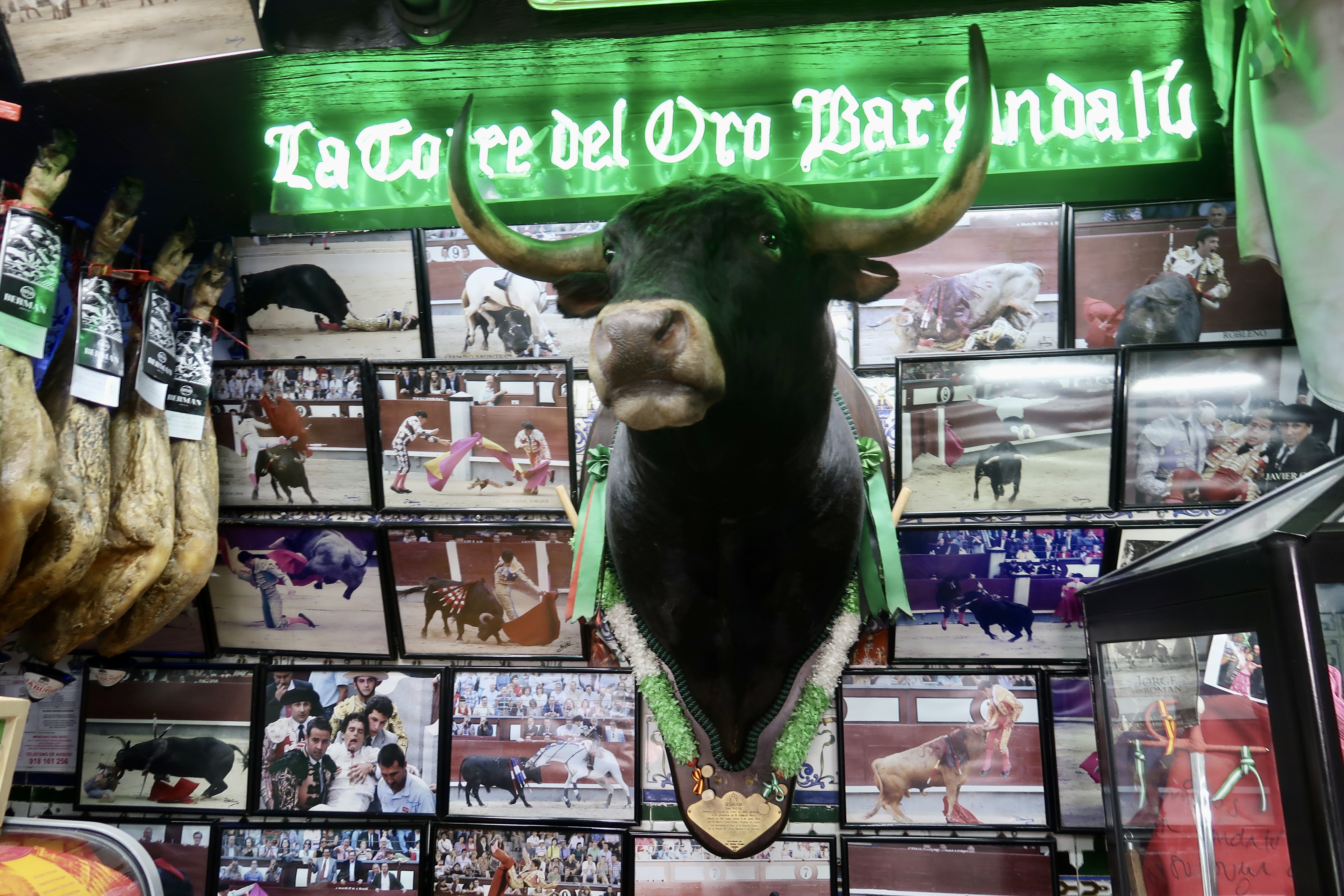 I stepped inside of La Torre del Oro Bar Andalú, a small bar and shrine to bullfighting. The walls are decorated with the stuffed heads of bulls and explicit photos of matadors being gored.