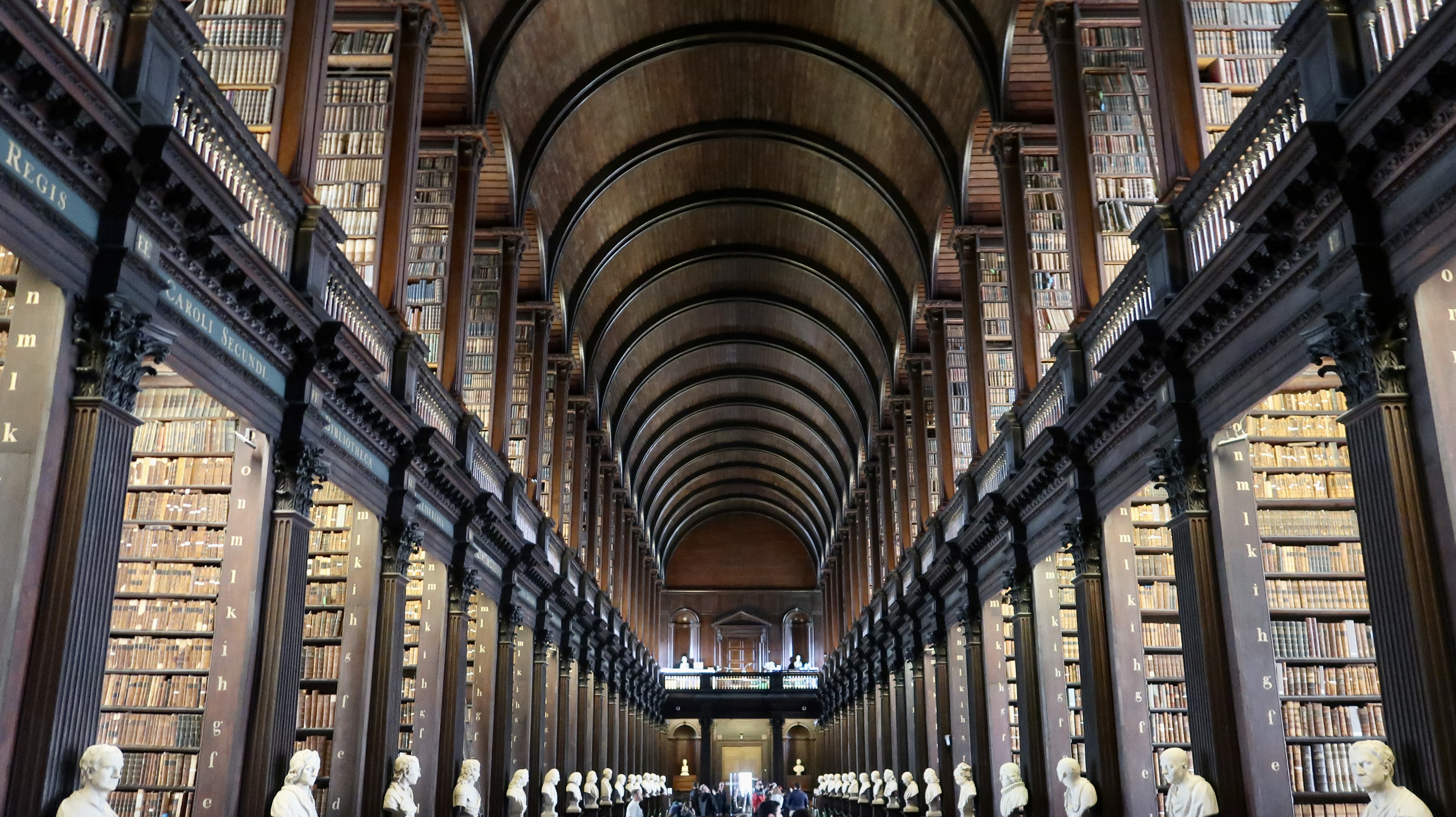 Upstairs is the Long Room in the college’s Old Library, one of the favorite rooms of my daughter, the librarian. It contains over two hundred thousand leather-clad books, stacked to the ceiling, many reachable only via flimsy wooden ladders. Marble busts of philosophers and writers line the hall.