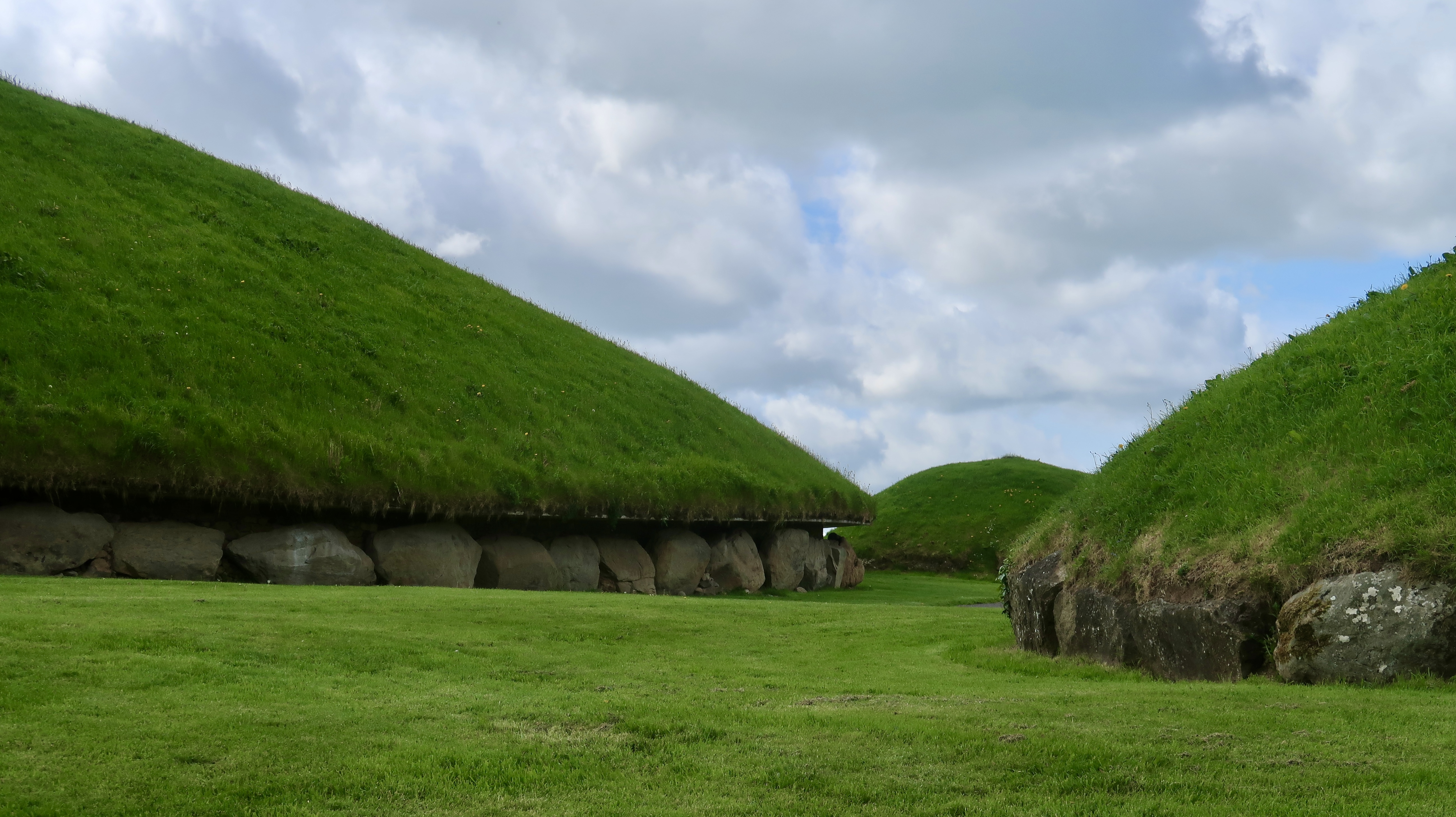The landscape is dominated by three large passage tombs, Knowth, Newgrange, and Dowth, built some five thousand years ago. (Passage tombs are burial chambers covered in earth and accessible through narrow tunnels.)