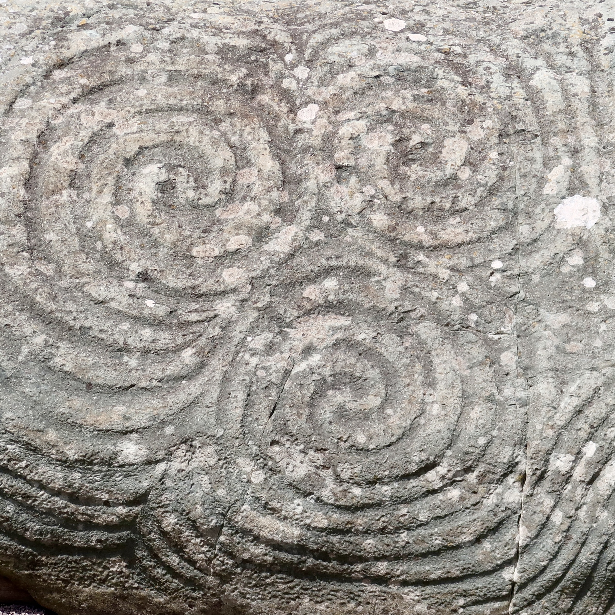 Like Knowth, Newgrange is also surrounded by decorated curbstones. The most impressive is the large entrance stone. A triple-spiral design on the stone is the poster child for Celtic art.