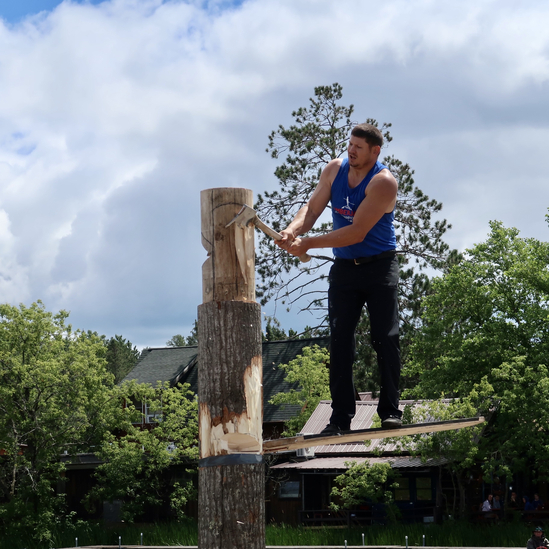 In Hayward, four lumberjacks at a time went head-to-head in this dangerous competition, all swinging axes while balancing precariously on planks nearly nine feet off of the ground.