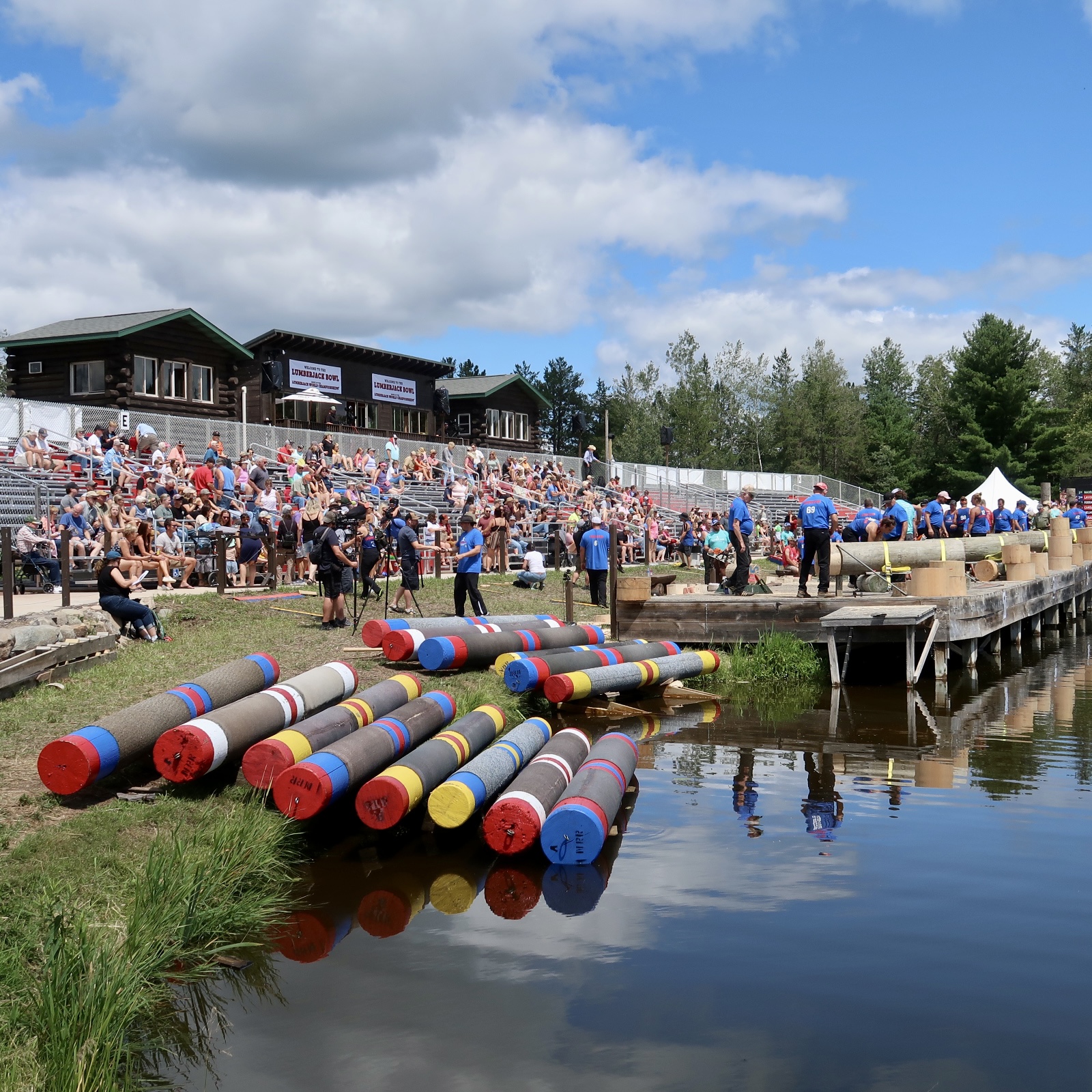 The field of competition is called the Lumberjack Bowl, essentially a row of high-school football bleachers facing a pond.