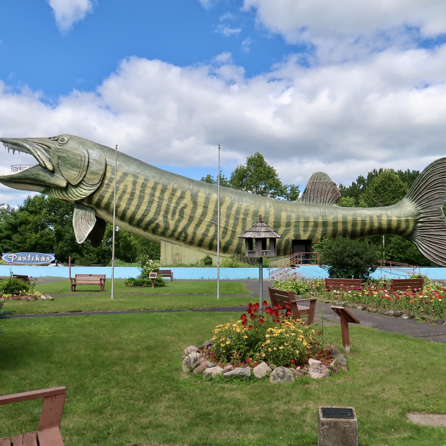 The giant musky is the world’s largest fiberglas structure, four stories tall and as long as three gray whales swimming end to end. Inside its belly is a museum.
