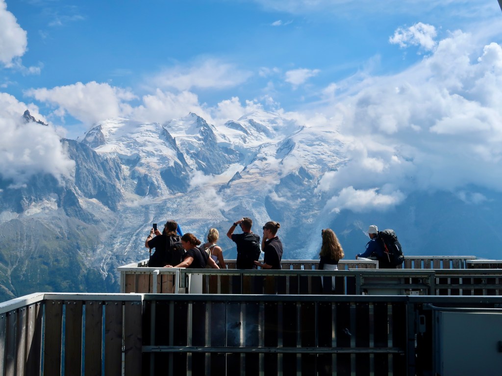 With binoculars, I watched little black specks moving through the snow—mountaineers traversing the ridge in Mont Blanc’s direction.