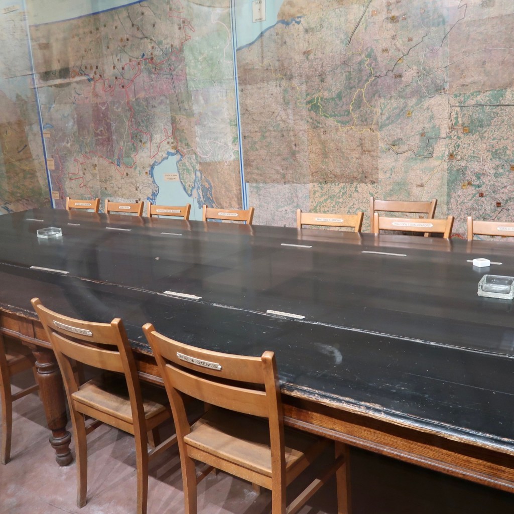 The school room where the signing took place looks much as it did in 1945. Wooden chairs surround a conference table, ashtrays at the ready. Military maps cover the walls. At the entrance, the flags of the United States, Great Britain, France, and Russia fly.