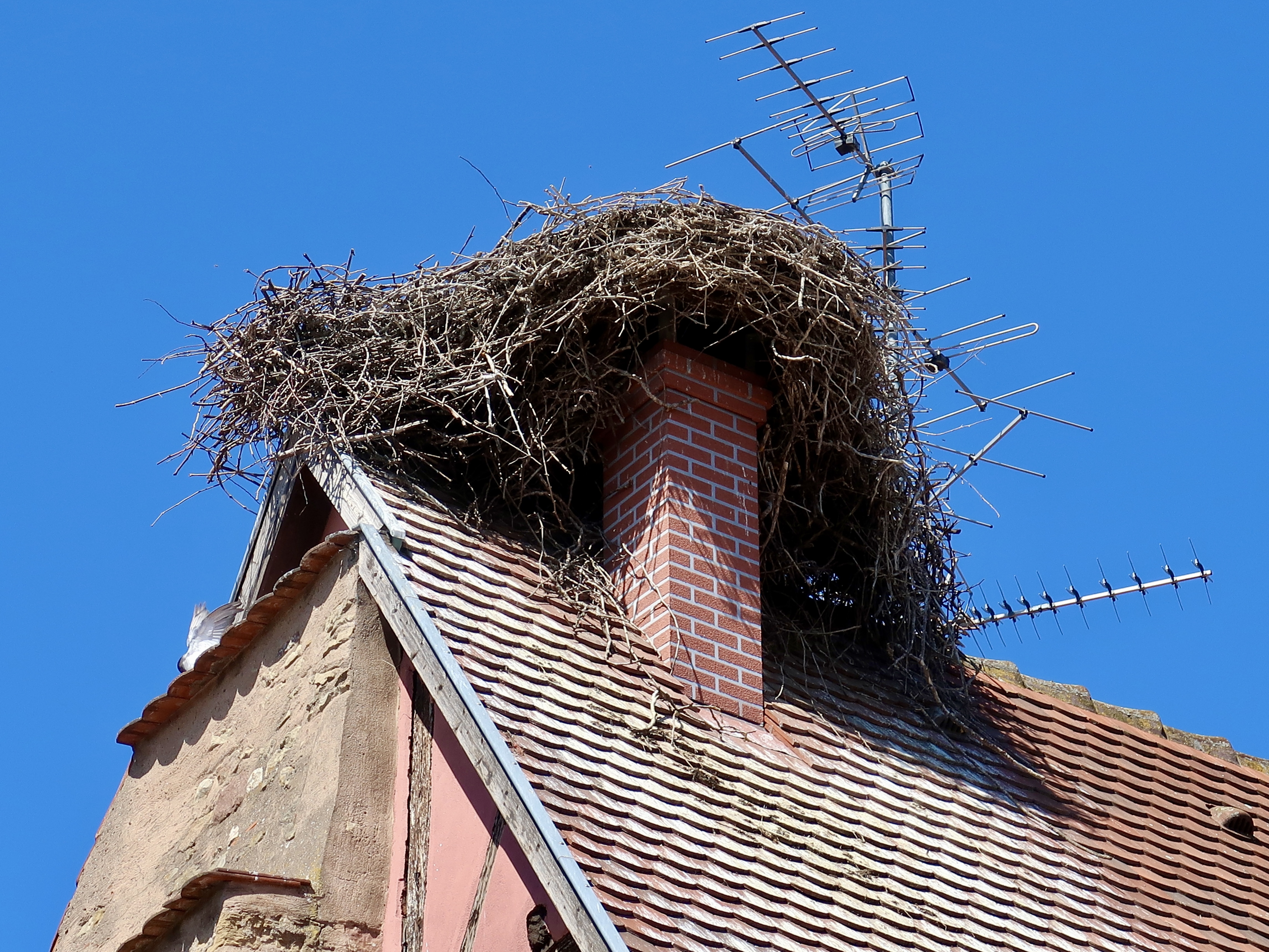 In the nearby village of Eguilsheim I noticed a couple of storks’ nests on top of chimneys. The nests are monstrosities that may weigh as much as one thousand pounds.